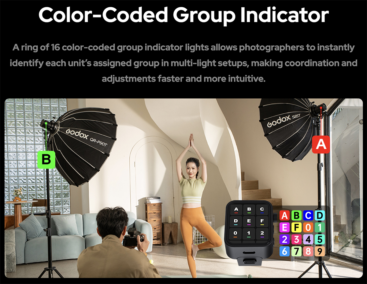 Its built-in 28–85mm zoom head provides precise light control, while the color-coded group indicator system makes multi-light setups faster and more intuitive.