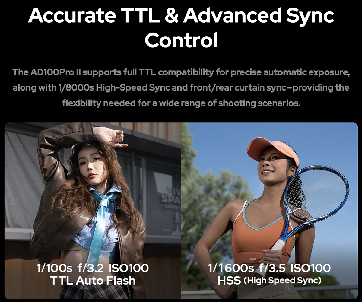 With an upgraded cooling system, the AD100Pro II can achieve 60–100 consecutive full-power flashes, ensuring reliable performance during demanding sessions. It also features a dual wireless system (2.4GHz & 433MHz) for enhanced signal stability and flexibility across different shooting environments.