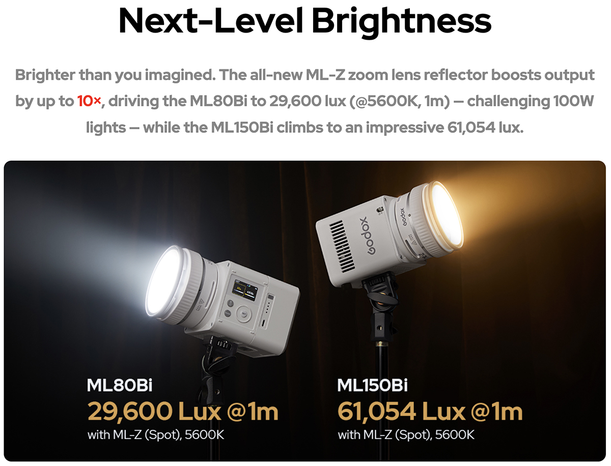 With the innovative ML-Z zoom lens reflector, brightness is significantly boosted—reaching up to 29,600 lux (ML80Bi) and 61,054 lux (ML150Bi) at 1 meter, making them comparable to or exceeding traditional 100W LED lights.