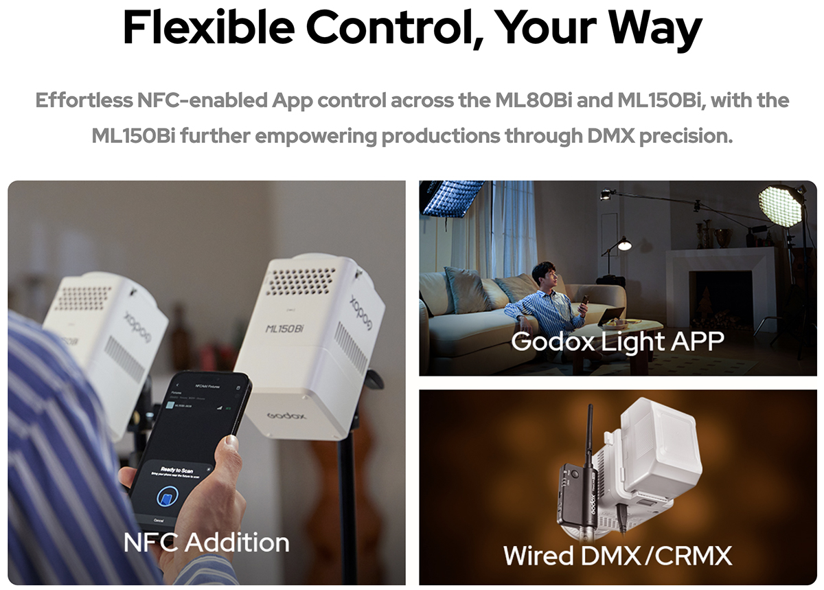 With Bluetooth app control, NFC pairing, and optional DMX (ML150Bi), you get precise and convenient control whether you're shooting solo or on a professional set.