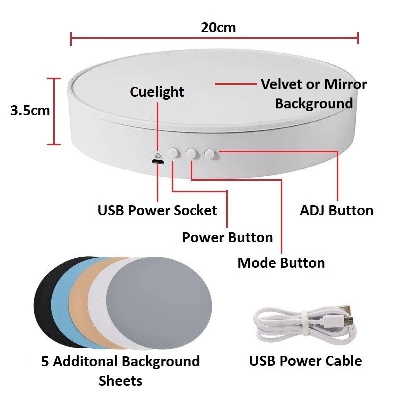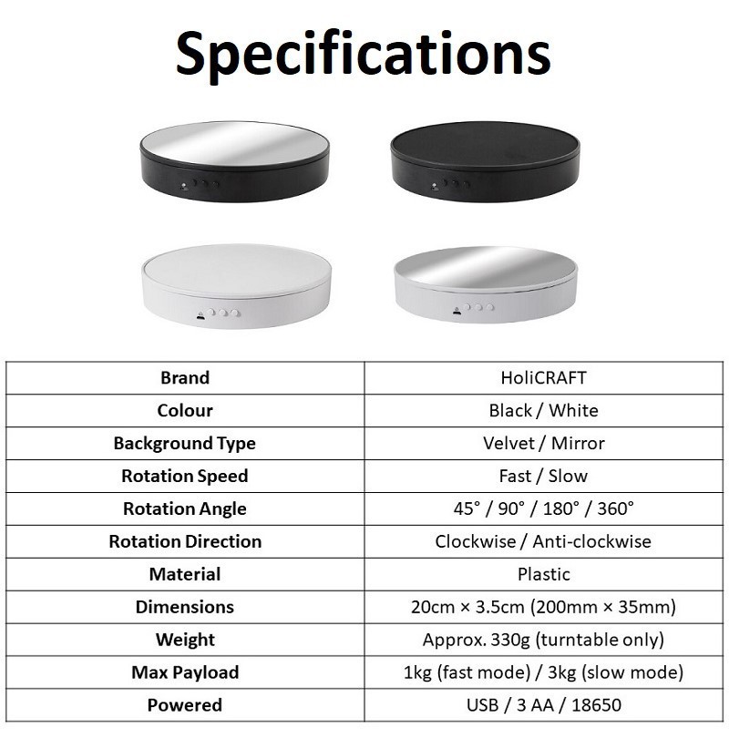 Lightweight and portable 2 Speed rotation 2 Rotation direction 4 Angles adjustment Quiet and smooth rotation Wide range of uses Boost product sales
