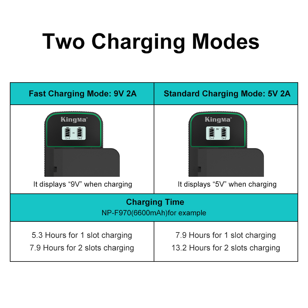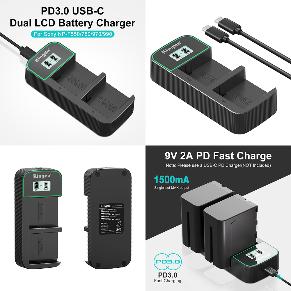 1 x KingMa Dual Slot USB PD3.0 Fast Charger (9V/2A) 2 x KingMa NP-F750 Battery (4400mAh) 1 x Type C USB cable