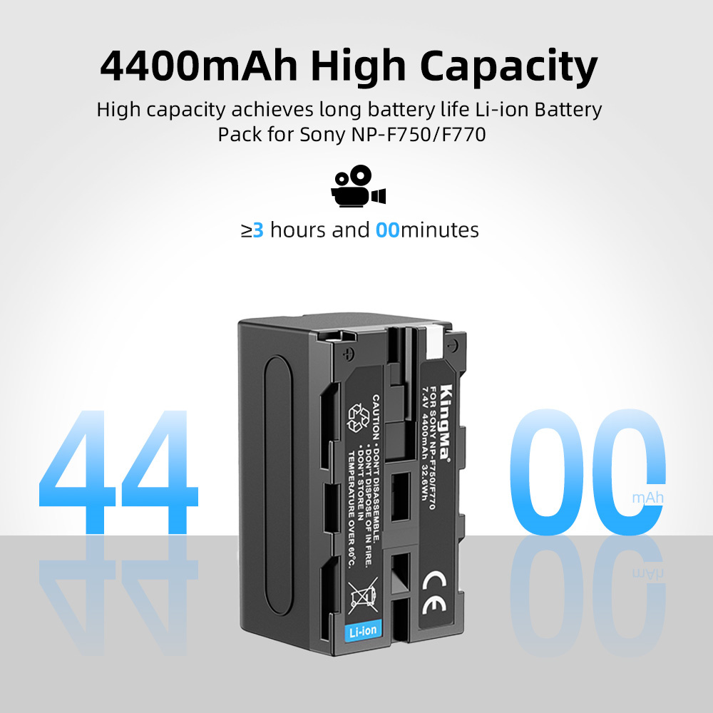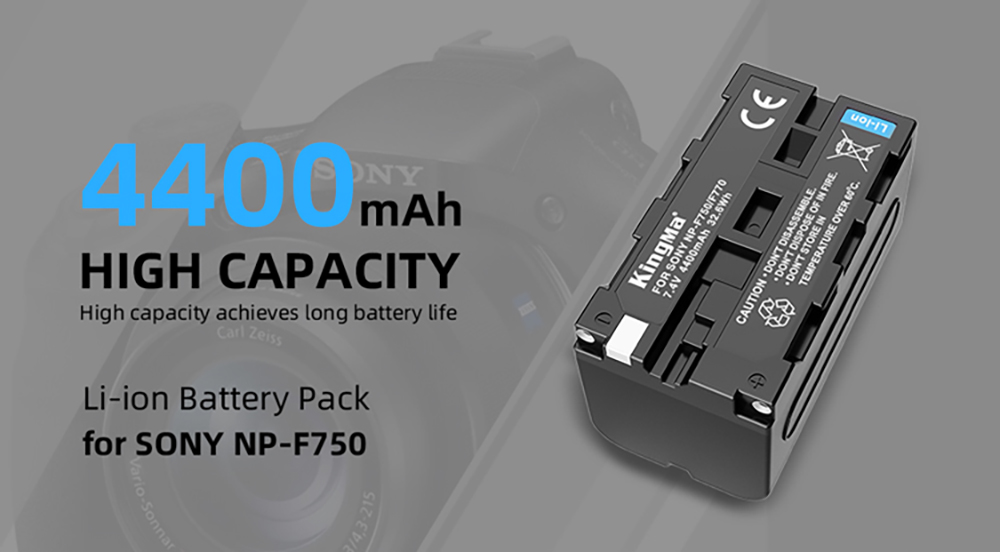 Each NP-F750 battery features 7.4V 4400mAh. Batteries and charger are fully decoded and are compatible. Innovative design allows charging of 2 batteries at the same time. The dual charger with LCD display allows users to easily check the power status when completed.