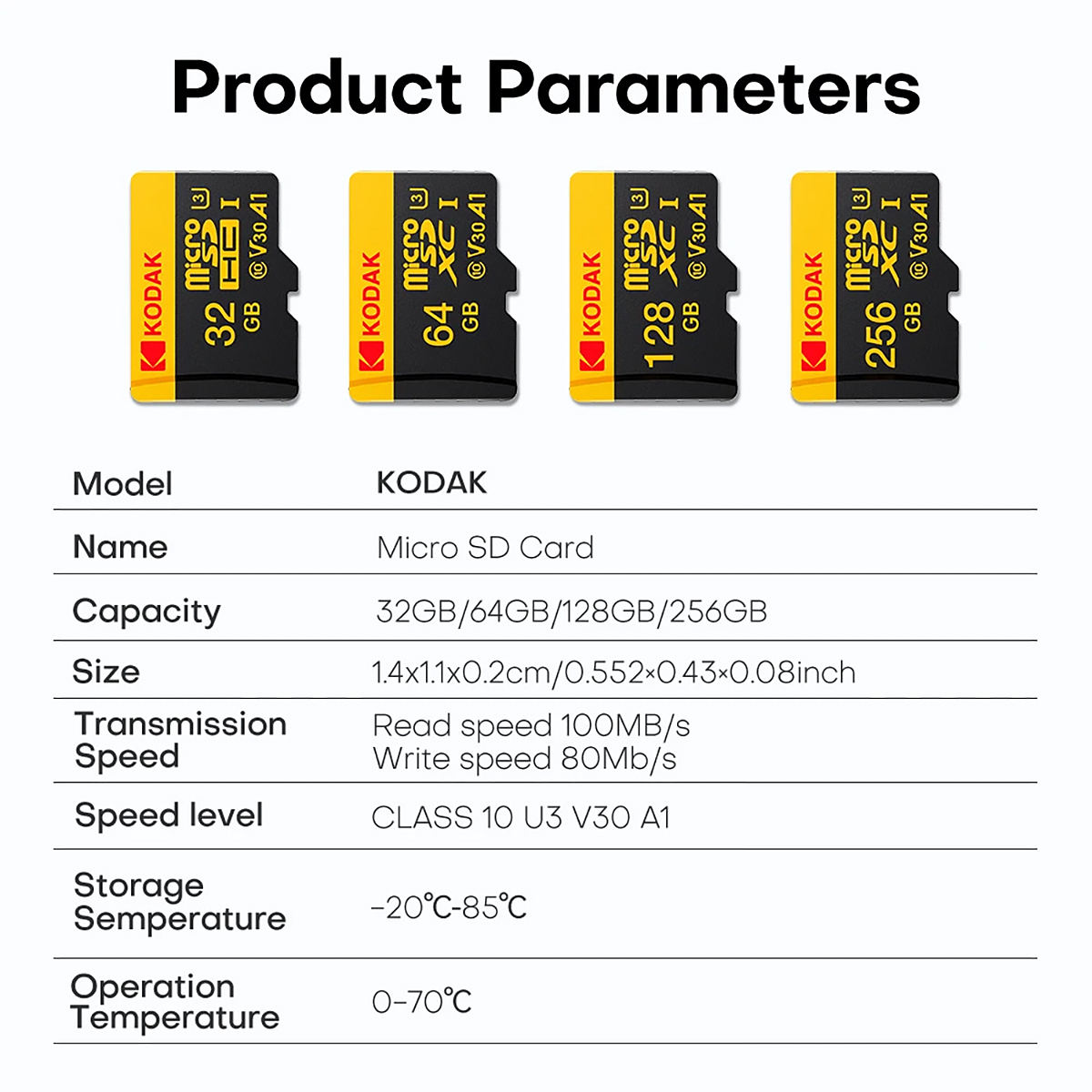 Up to 80MB/s write speed: Ideal for continuous high speed shootings , 4K recording and fast download of multimedia files onto your mobile device. Up to 100MB/s read speed: For super fast transfer of high resolution pictures and 4K videos as well as larger media files onto microSD compatible devices or SD compatible devices using the SD adapter. Kodak cards are compatible with any camera supporting SDXC standard, including Kodak cameras FZ45 / FZ55.