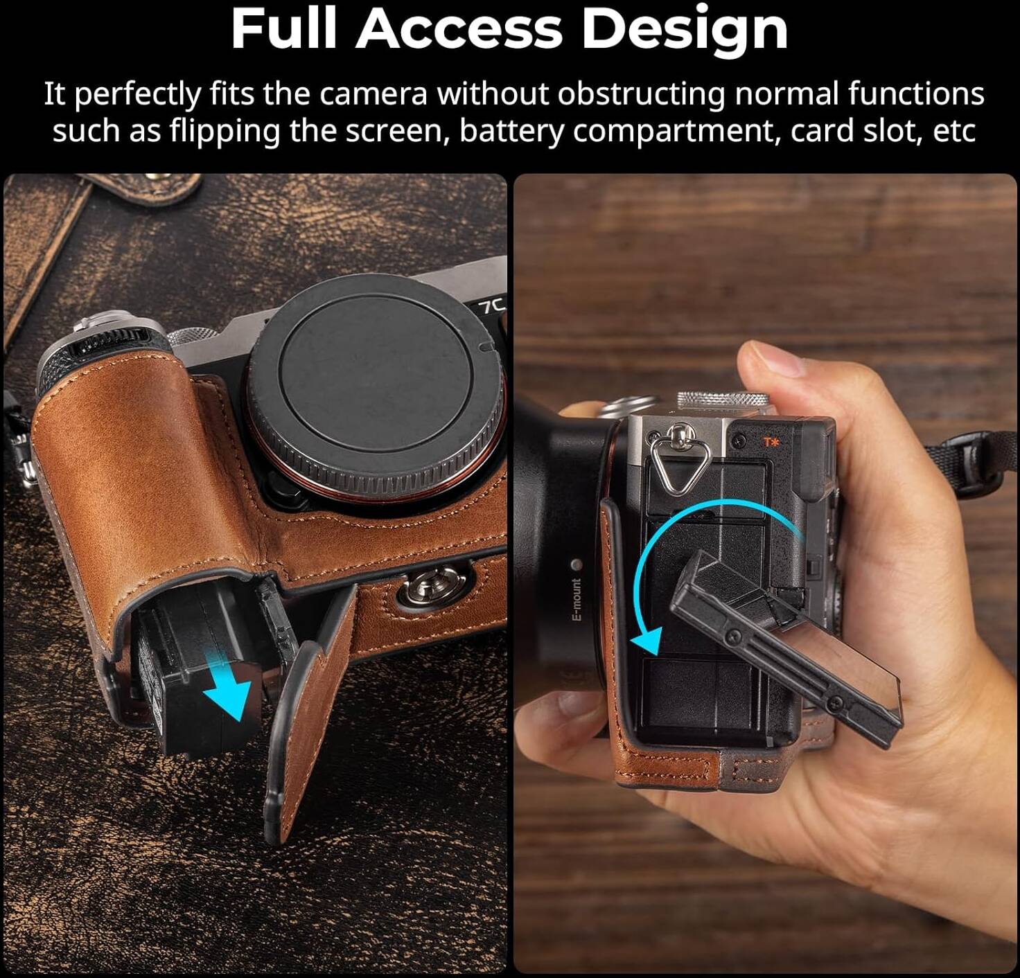 Protects the camera body from scratches, dust, and daily wear-and-tear. The leather texture and form-fitting shape provide a more comfortable and secure grip. Allows for quick battery and memory card changes, as well as easy tripod mounting without removing the case.