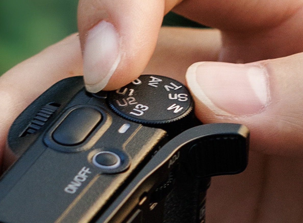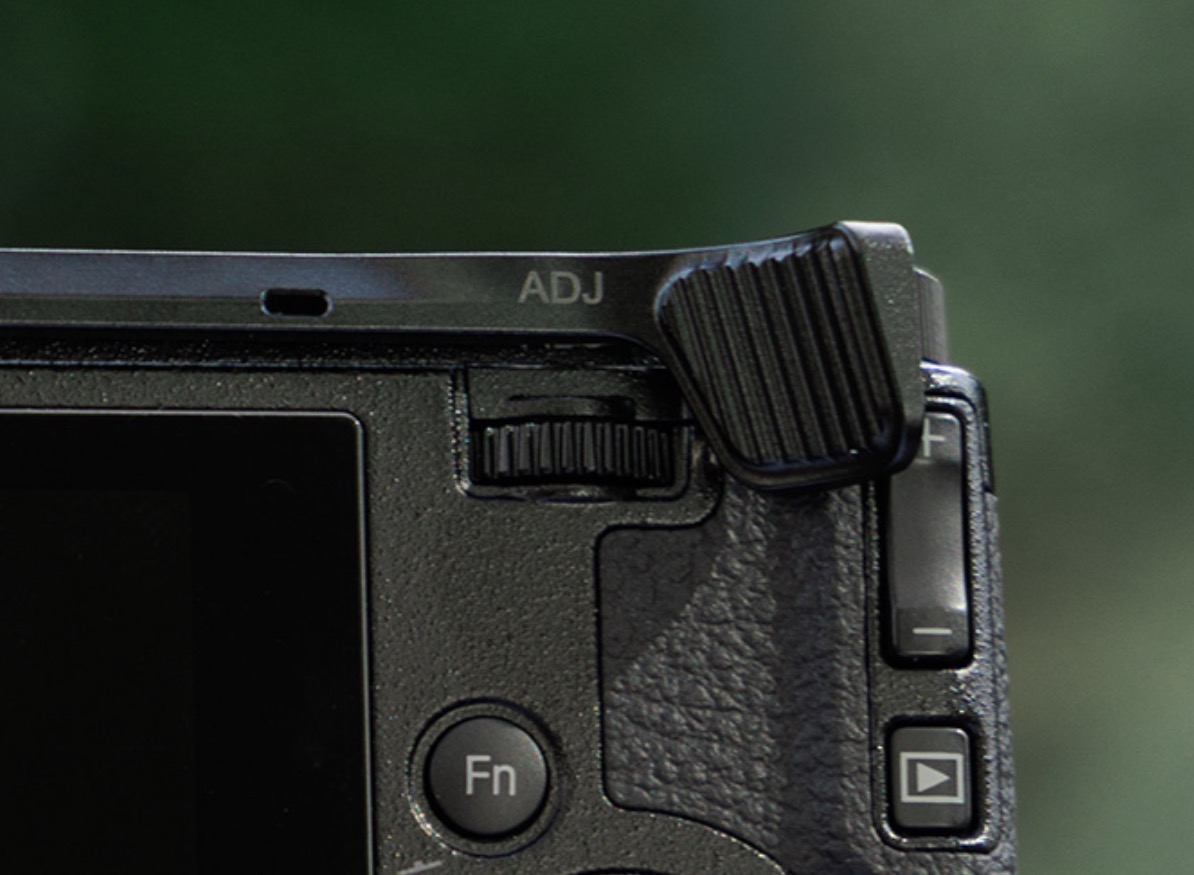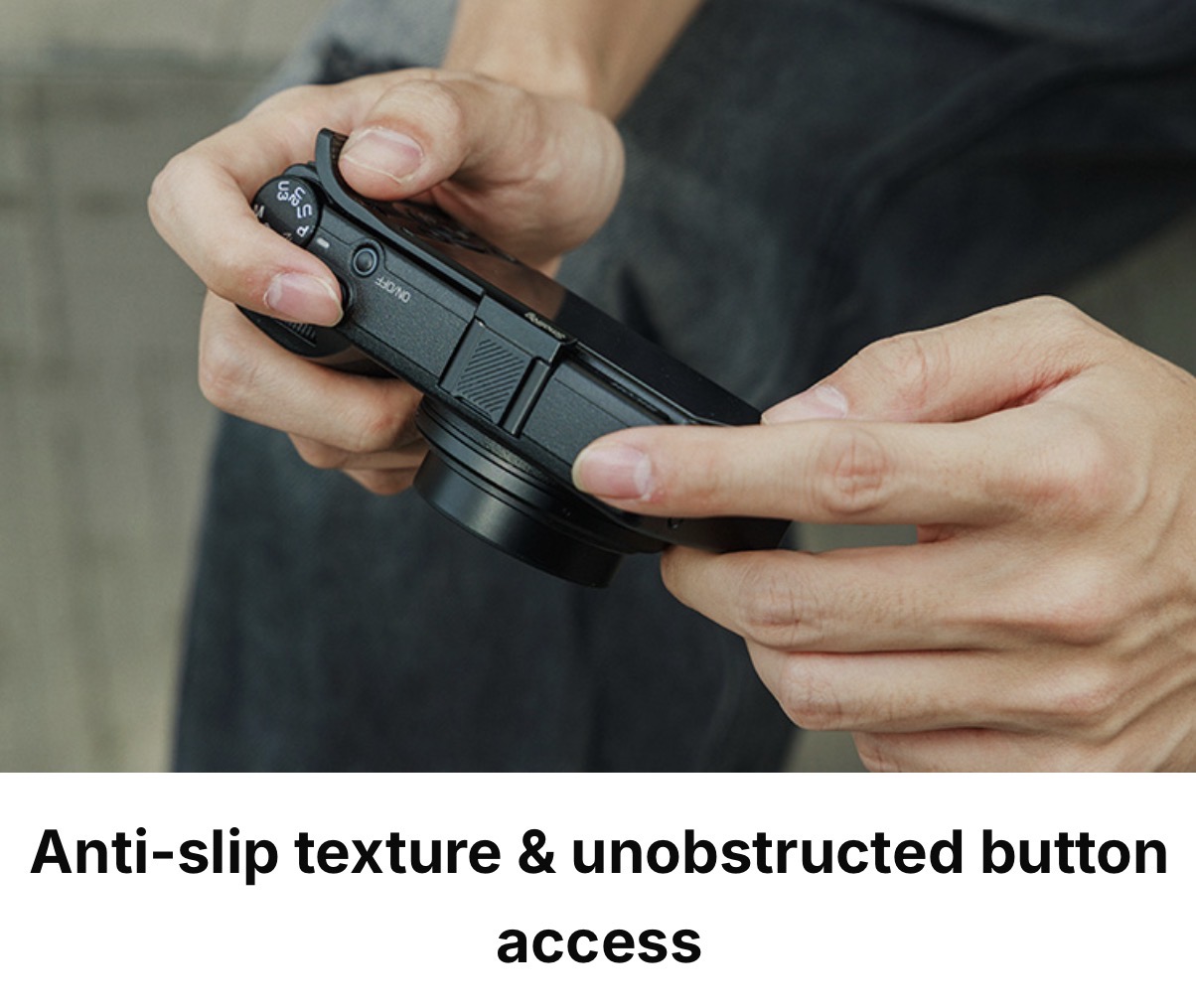 The design ensures full functionality of the camera, avoiding interference with the ADJ. lever, mode dial, or the front status lamp. Constructed from aluminum alloy, it is durable yet lightweight, making it ideal for a compact camera setup.