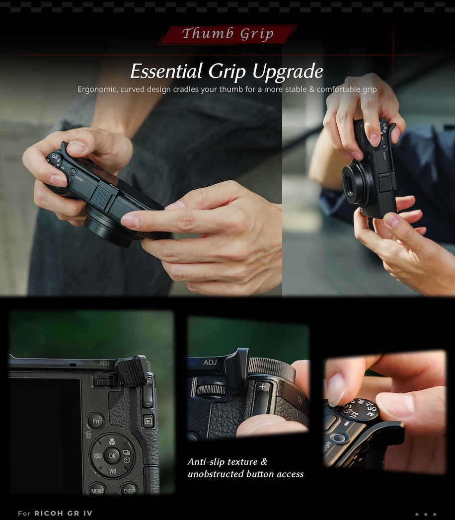 The SmallRig Thumb Grip for Ricoh GR IV is an ergonomic accessory designed to enhance the handling, stability, and comfort of the camera, particularly for street photography and one-handed shooting. It is engineered to fit into the camera's hot shoe, providing a secure, textured thumb rest that allows for a more comfortable grip without hindering access to controls.