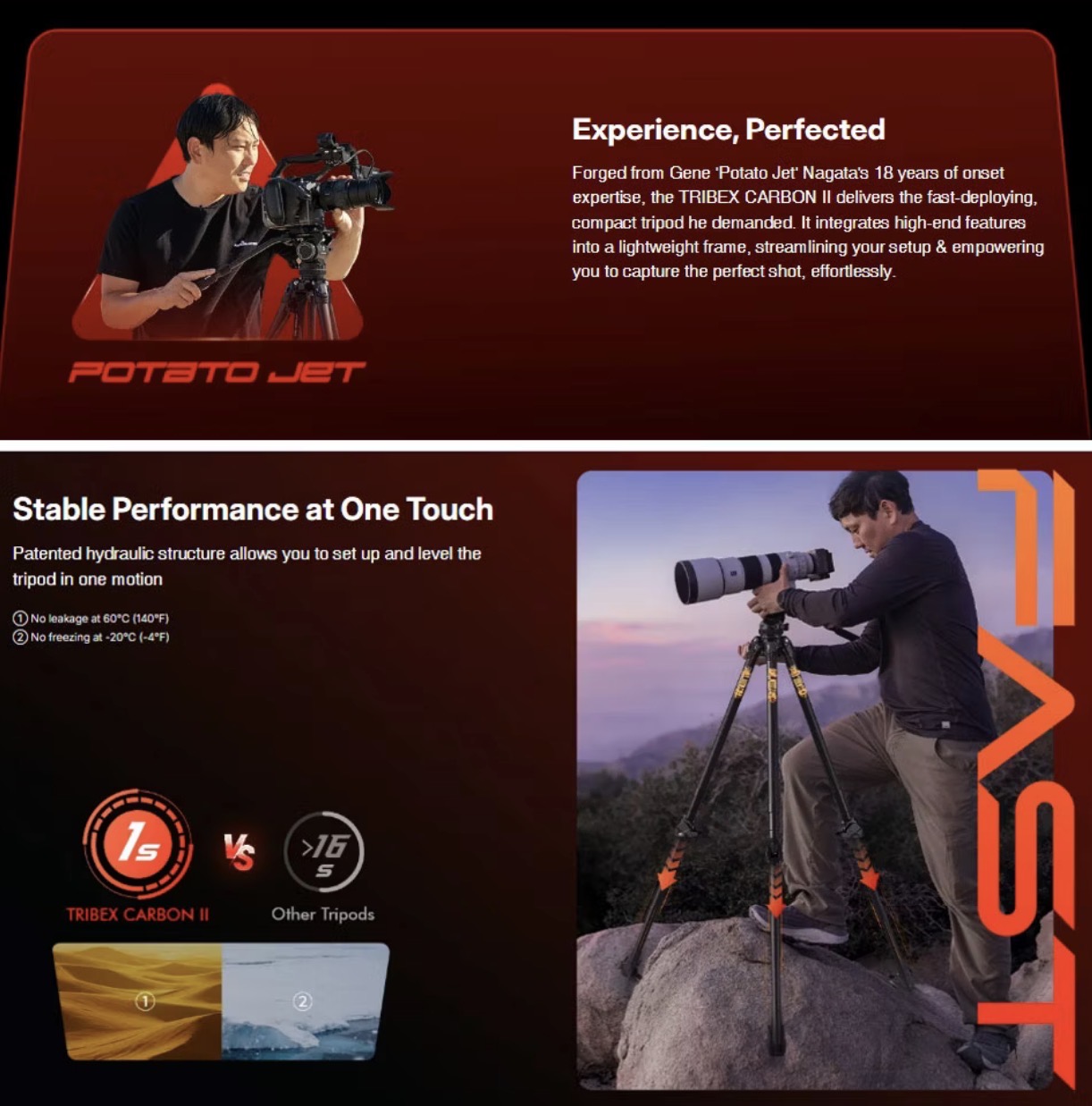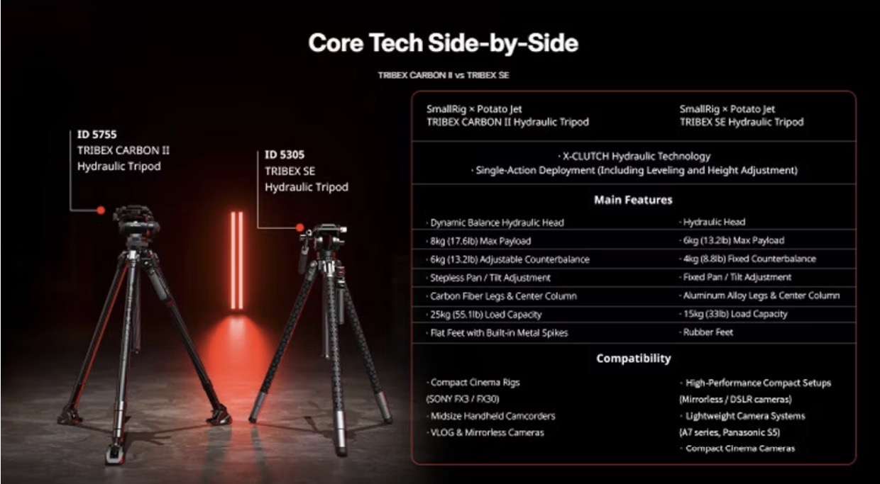 The SmallRig x Potato Jet TRIBEX Carbon II Tripod Kit (5755) is a professional, lightweight, and fast-deploying carbon fiber tripod, designed in collaboration with Potato Jet for videographers and content creators. Its primary highlights and features include patented hydraulic clutch technology for rapid setup and a versatile, high-load-capacity carbon fiber build.