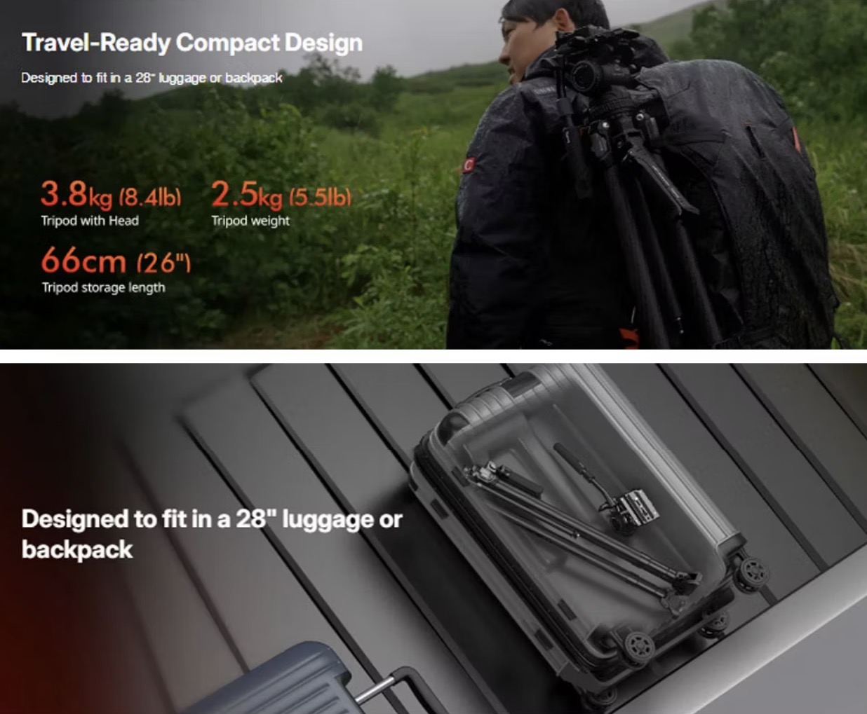 Made from carbon fiber, the tripod legs and center column offer a high load capacity of 25kg (55 lbs) while keeping the overall kit weight around 3.8kg (8.3 lbs). The head supports up to 6kg (13.2 lbs) and provides smooth, professional-grade movement with stepless pan and tilt damping.