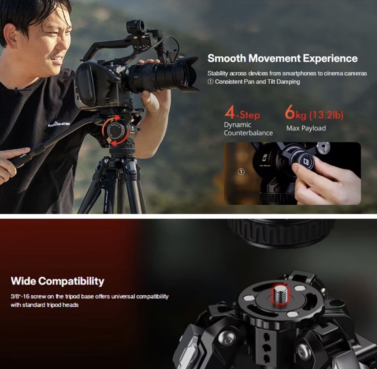 This feature enables rapid setup, allowing simultaneous extension, positioning, and locking of all three legs with a single squeeze action. The fluid head offers a 4-step adjustable counterbalance (0, 1, 2, 3) for precise stability with camera setups up to 6kg (13.2 lbs).