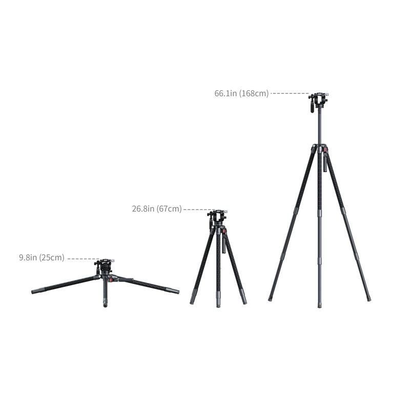 Lightweight Aluminum Alloy Tripod Easy X-Clutch Hydraulic Setup/Breakdown Fluid Head with Fixed Counterbalance 9.8 to 66.1" Height Range 27.9" Folded Length 13.2 lb Maximum Payload Manfrotto-Style Quick Release Plate Touch-and-Go Quick Release Mount 1/4"-20 Threads for Accessories Rubber Feet