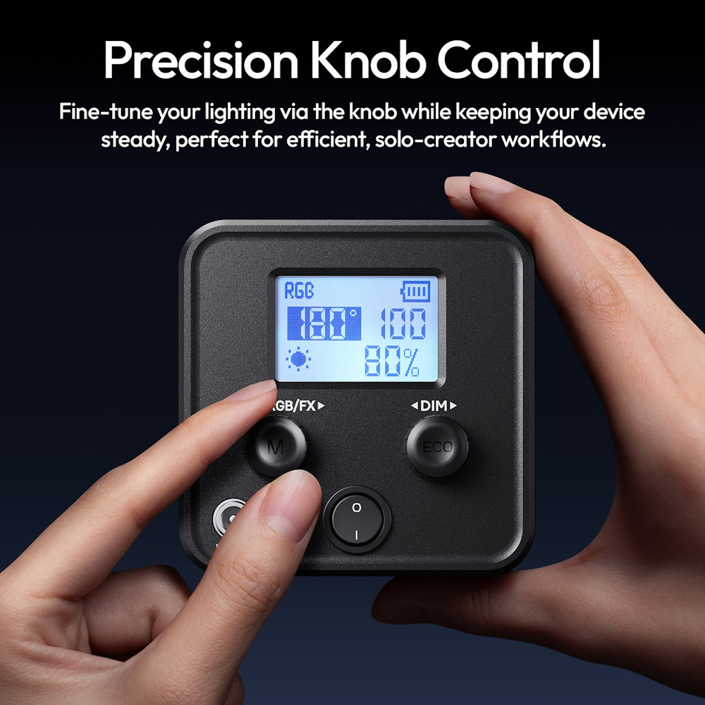 The intuitive control interface lets you toggle between CCT Mode (2500 K–6500 K), RGB Mode (360° hue & saturation control), and Scene Effects with smooth adjustments. With its mini Bowens mount and 1/4″ threads, professional light modifiers are easy to attach, expanding your creative lighting possibilities.