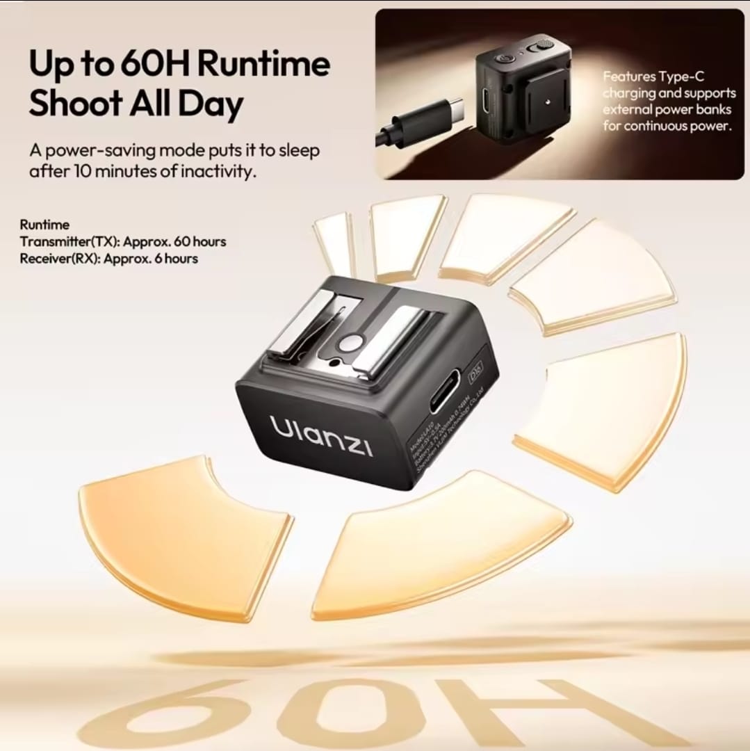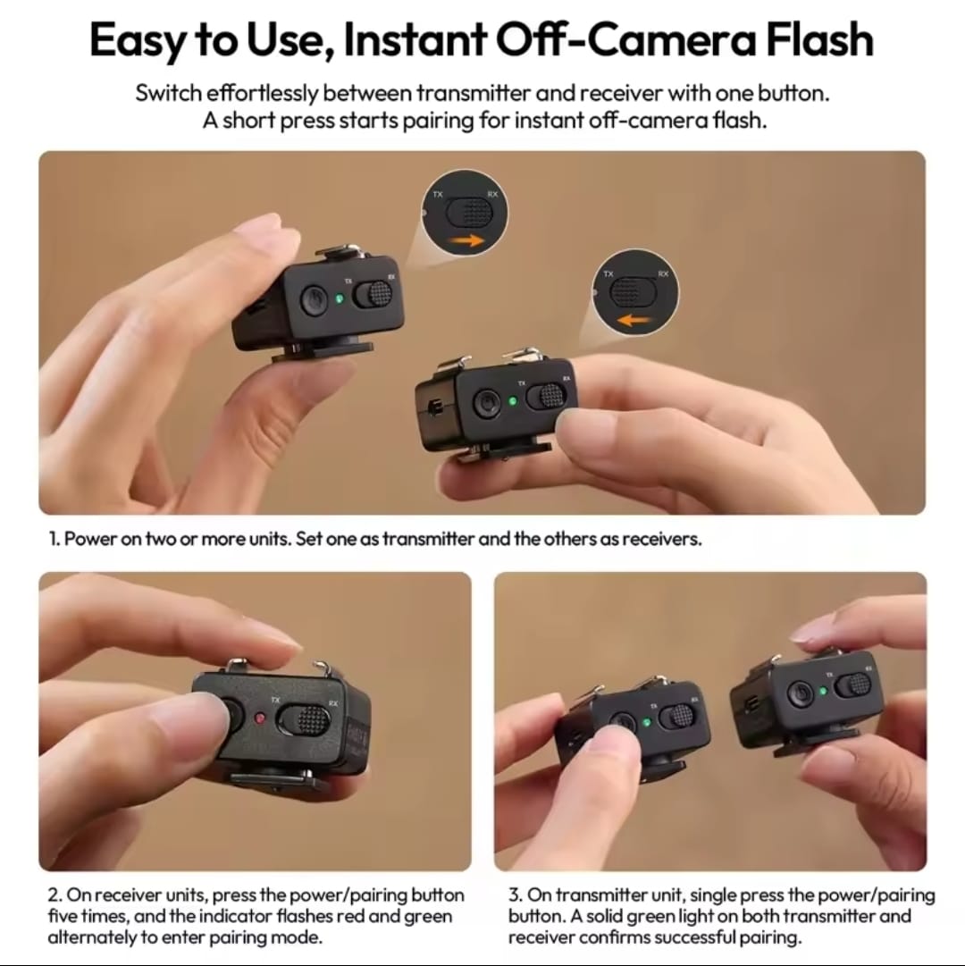 Ultra-compact & lightweight (≈20 g) for easy carry & setup 2.4 GHz wireless flash triggering with reliable connection up to ~8 m Dual-mode TX/RX (Transmitter/Receiver) in one unit Universal single-contact hot shoe for wide camera/flash compatibility Type-C charging with long battery life (≈60 hrs TX mode) Auto sleep mode after inactivity to save power