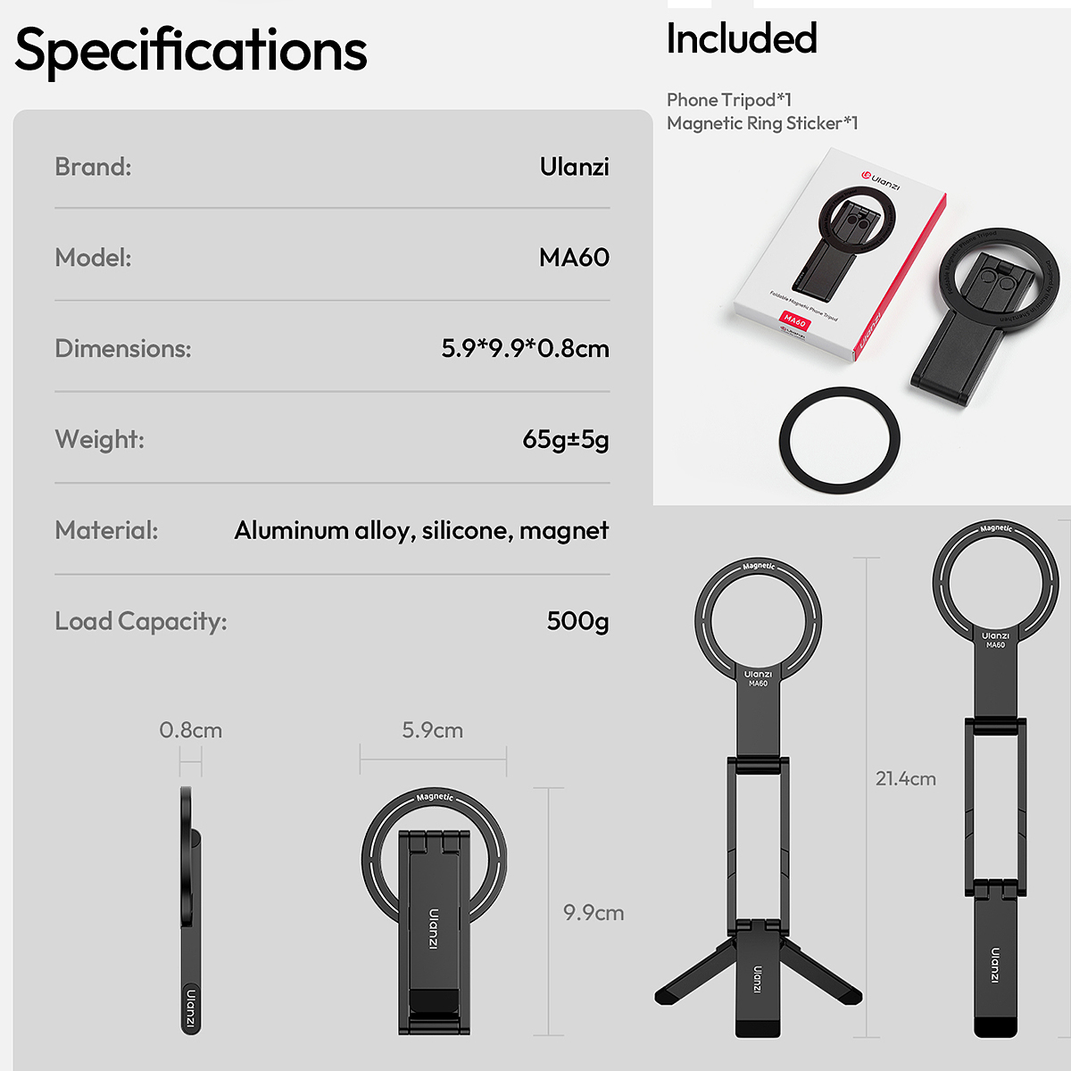 Elevate your mobile content creation with the Ulanzi MA60 Foldable Magnetic Phone Tripod — a sleek, portable tripod that snaps onto your phone with strong magnetic force for rock-steady shots. Whether you’re livestreaming, vlogging, taking timelapse videos, shooting flatlays, or doing Zoom calls, this tripod adapts to your workflow.