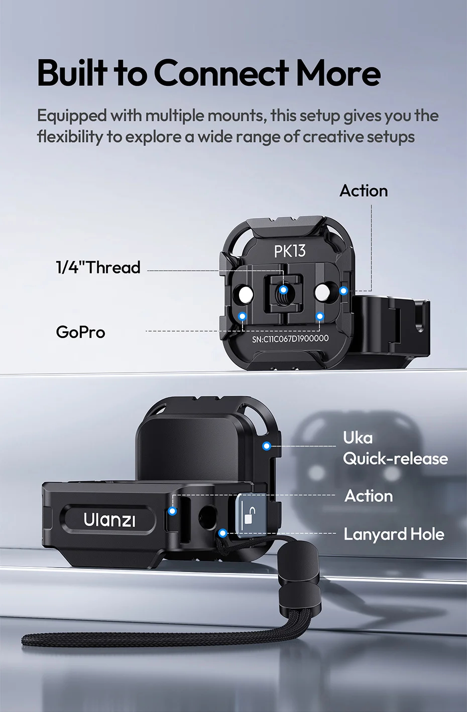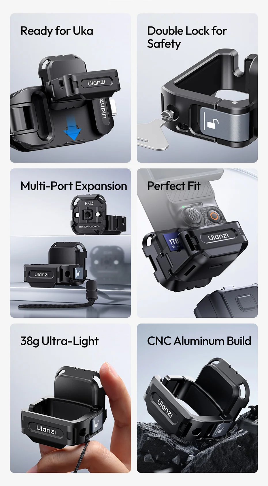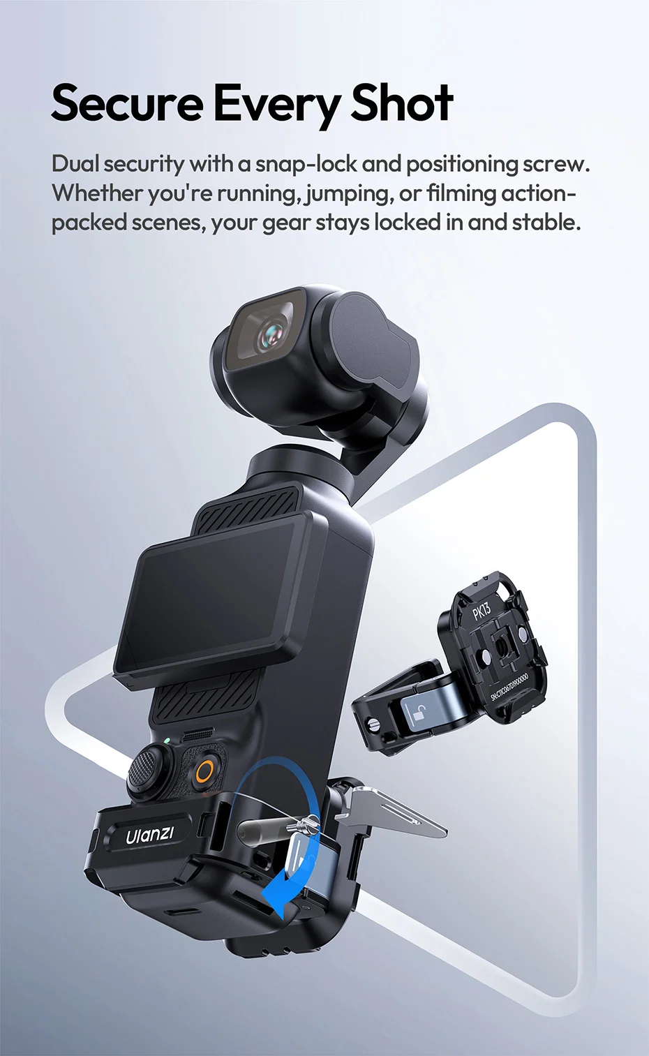 Ulanzi PK13 is compatible with DJI pocket 3 original protective case. Equipped with multiple mounts, this setup give you the flexibility to explore a wide range of creatives setup. Dual security with a snap-lock and positioning screw. Whether you're running, jumping, or filming action-packed scenes, your gear stays locked in and secured.