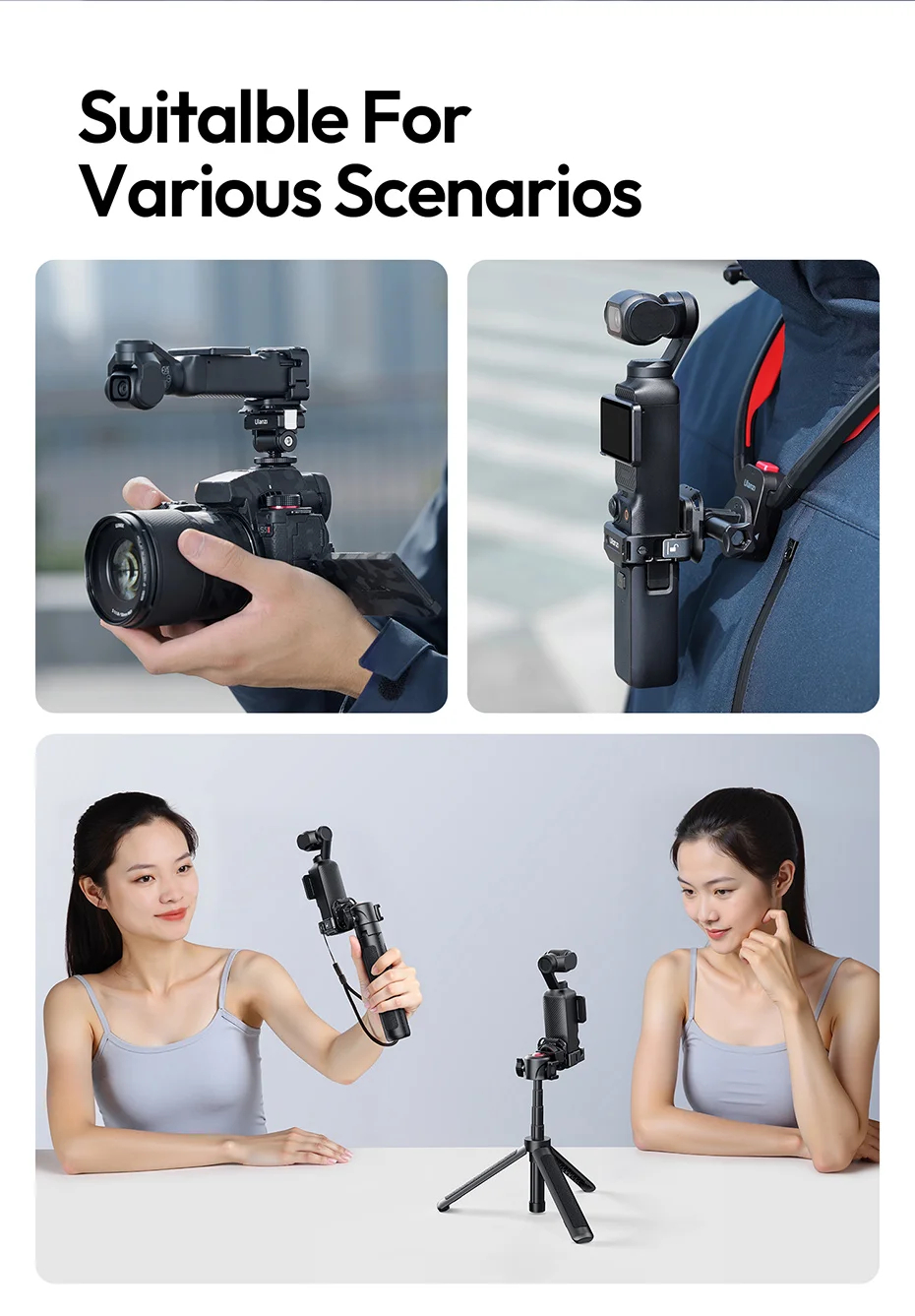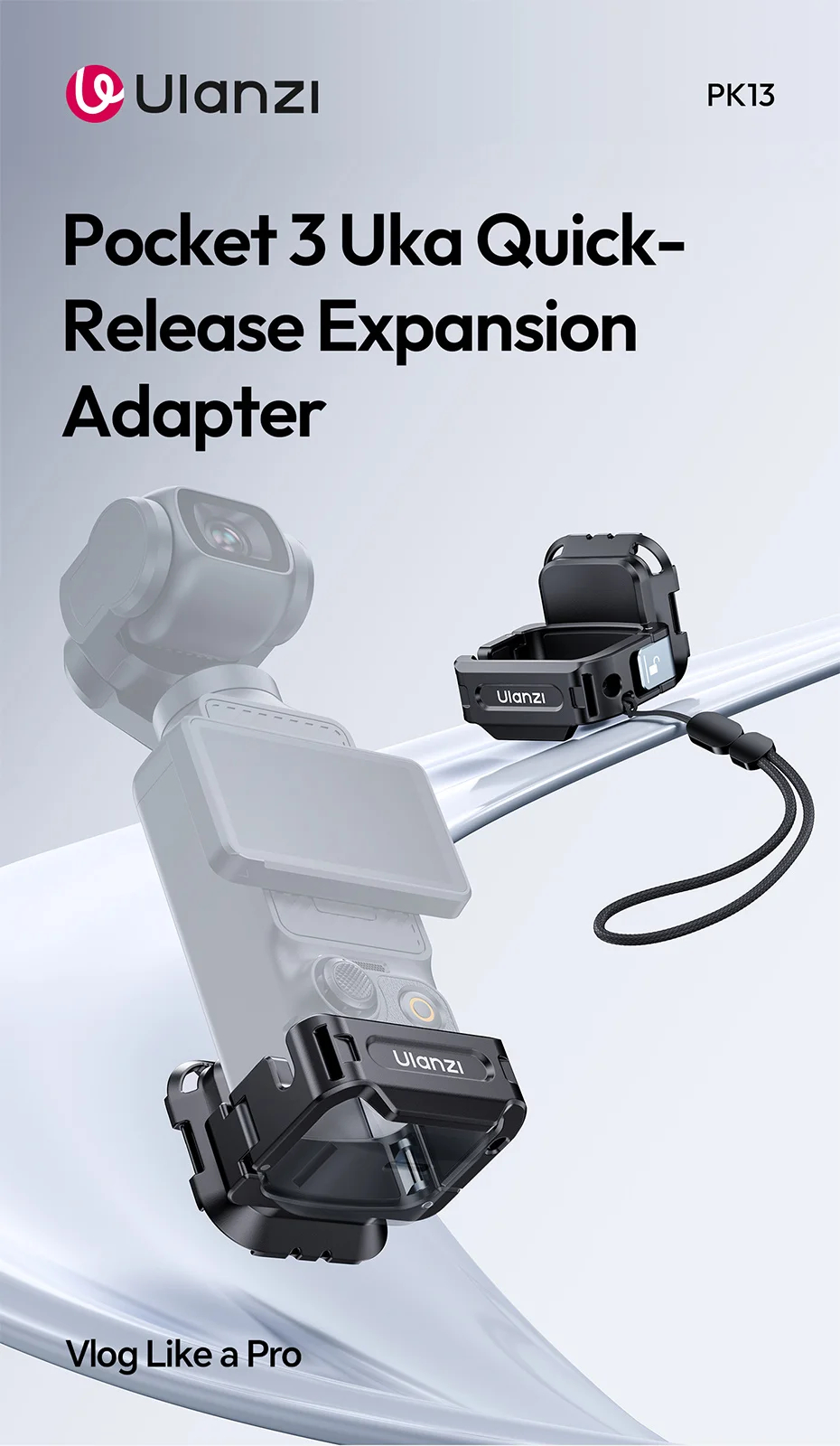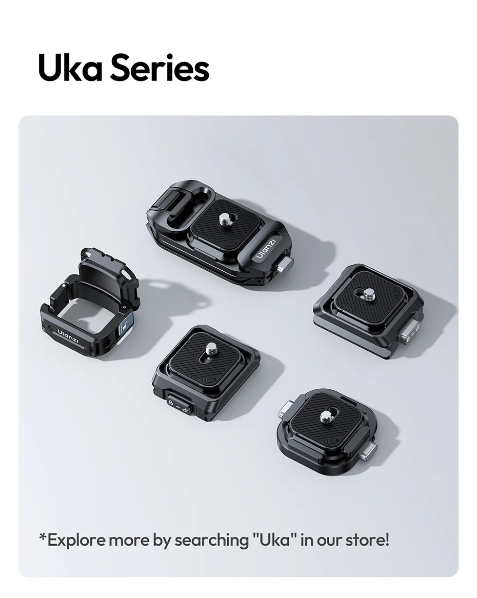 Ulanzi PK13 Pocket 3 Uka Quick Release Expansion Adapter with a perfect fit and no interference, the screen, joystick, memory card, and handle all remain fully accessible. Work will all Ulanzi Uka series of mount, ballhead or tripods. Weighing only 38g, it won't weigh you down and include a wrist strap for extra security.