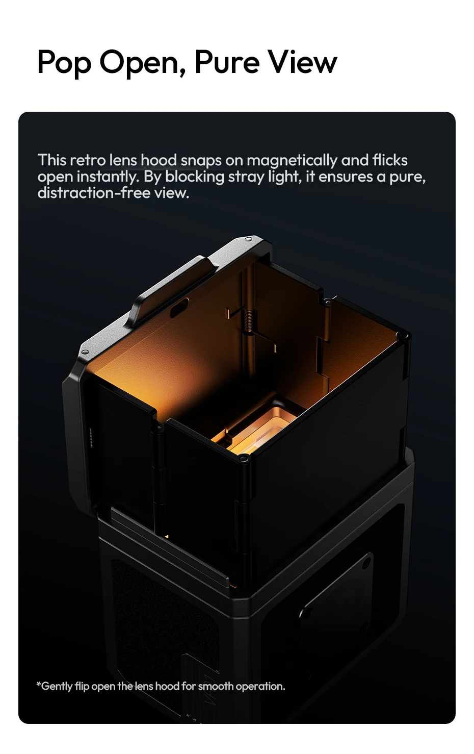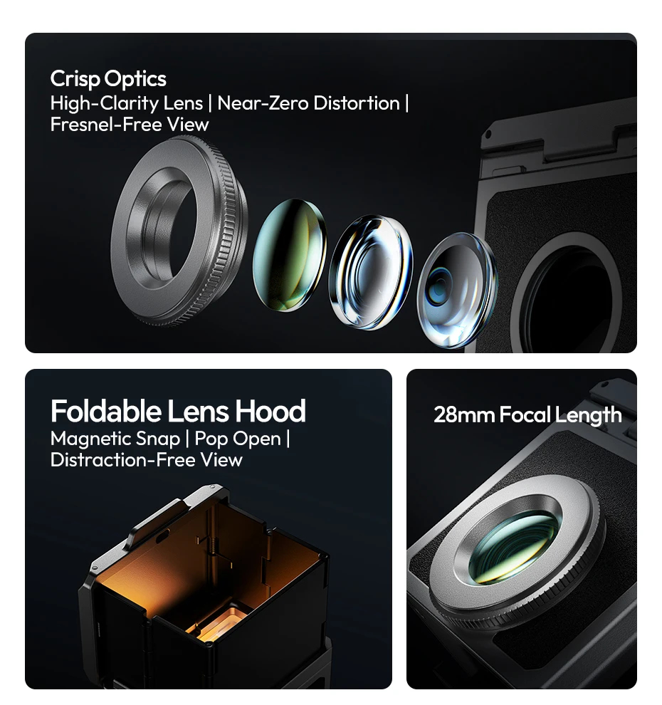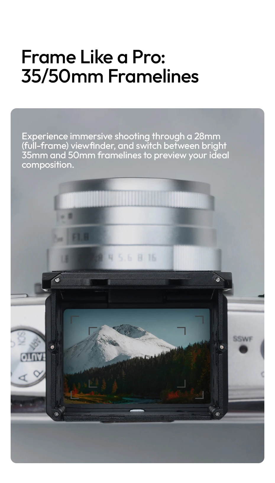 Equipped with a high-clarity 3-element lens group and a ground-glass focusing screen, the VF01 offers a bright, distortion-free view that helps you concentrate on framing with minimal eye strain. Framelines for 35 mm and 50 mm simulate classic focal lengths, while the magnetic retro hood instantly blocks stray light when popped open. The viewfinder mounts easily to most cameras via a standard cold shoe, making it a versatile and stylish tool for on-the-go creators.