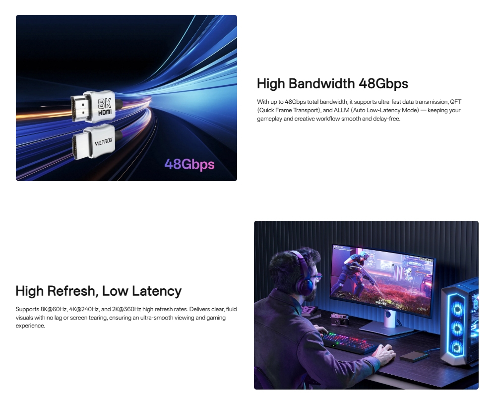 Step into the next generation of visual fidelity with the Viltrox 8K HDMI Cable — engineered for creators, videographers, and gamers who demand uncompromising performance. With full HDMI 2.1 support and a blazing 48 Gbps data rate, this cable delivers crystal-clear, real-time 8K video without lag or distortion.