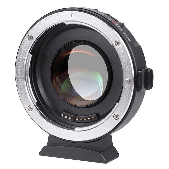 This 0.71x Lens Mount Adapter from Viltrox allows a full-frame Canon EF-mount lens to be mounted onto a Micro Four Thirds camera. While doing so, the adapter's optics help to maximize the connected lens's apparent angle of view while providing a one-stop increase for the camera over the lens's aperture range.