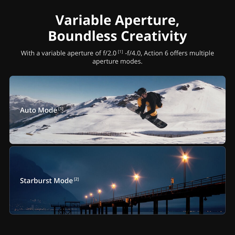 DJI Osmo Action 6 is DJI’s newest flagship action camera, built for adventurers, vloggers, and creators who want professional-grade footage in a rugged, portable package. It introduces DJI’s first adjustable aperture (f/2.0–f/4.0) and a large 1/1.1″ square CMOS sensor for improved low-light performance, expanded dynamic range, and flexible shooting formats. These innovations help you capture ultra-smooth 4K video, crisp 38 MP photos, and cinematic shots in nearly any environment.
