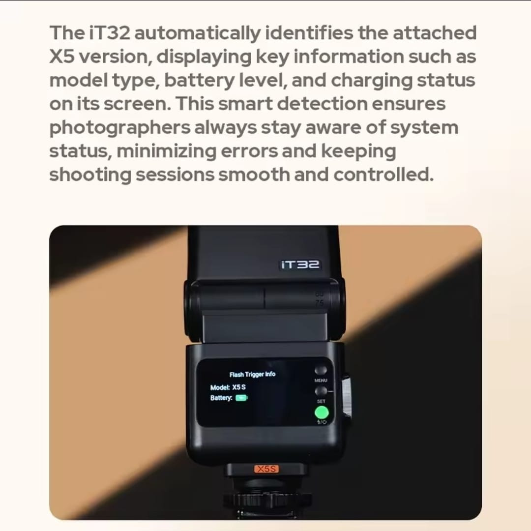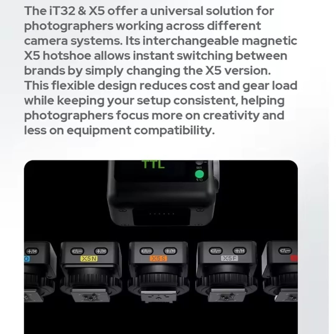 Its modular approach lets you quickly swap X5 versions tailored for Canon (C), Nikon (N), Sony (S), Fujifilm (F), or OM System/Panasonic (O), so you can use the same flash body across multiple systems without compatibility worries. The integrated Godox 2.4 GHz wireless system supports up to 32 channels and multiple groups, making it ideal for multi-flash setups. Although specially designed for iT32, the X5 can also control other Godox flashes within the Godox 2.4GHz wireless X system.