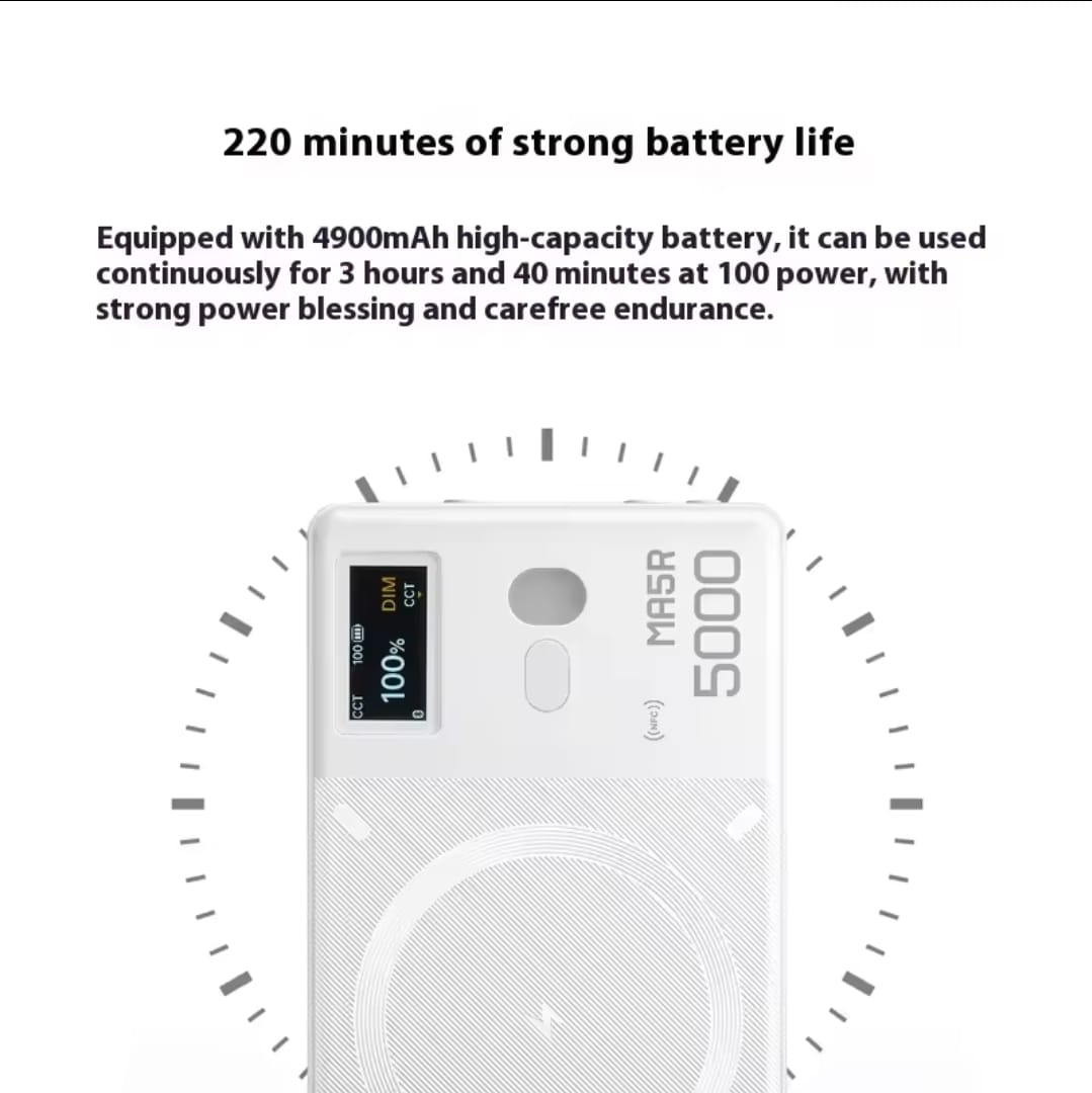 The Godox MA5R is designed as a hybrid smartphone-friendly LED light and power bank — a small, pocket-sized accessory that delivers surprisingly versatile lighting for mobile photography, vlogging, selfies, video calls, or quick content creation sessions. With a sleek, minimal footprint (~13 mm thickness, 164 g weight), it magnetically attaches to MagSafe-compatible phones (or phones with a magnetic ring accessory) — offering a lightweight and highly portable lighting solution.