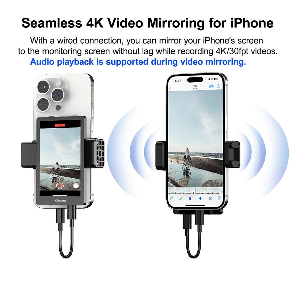 Perfect for live streaming to address the words orientation issue Utilize the rear facing camera for high resolution images of portrait or product Very secure connection of the monitor screen to the phone Wide-angle photo or video taking are made easy Suitable for IOS or Android devices Connection wirelessly using Phone's Wifi or by data cable (not included) 4K video shooting without lag KingMa VL-PH01 Max: Any phone with width up to 9cm KingMa VL-PH02 Max: Magsafe phone/case compatible / Any phone when used with the supplied Magnetic Ring 2 hours of use on a full charge Use a powerbank for uninterrupted or longer period of use