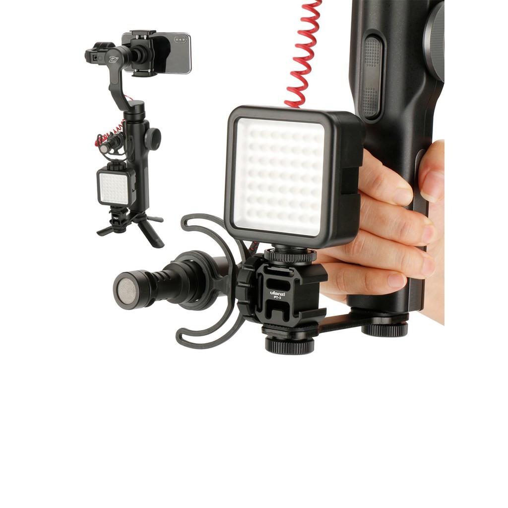 THREE COLD SHOE MOUNTS: Can be used as an extension bar for handheld gimbal to install microphone and led video light at the same time. ALUMINUM ALLOY MATERIAL: Made of high-quality metal material, durable to use. UNIVERSAL 1/4''-20 SCREW: Perfectly suitable for Zhiyun Smooth 4/Smooth Q/ DJI Osmo Mobile 2/ FeiyuTech Vimble 2 Gimbals which has 1/4'' screw on the bottom. REMOVABLE COLD SHOE HEAD: The cold shoe head can be removed, and you can use it on other device which has 1/4'' screw. BEST ACCESSORY FOR GIMBAL: Solve microphone and light problem at the same time, and you can also add one mini tripod on the bottom of it. A neccessory tool for video shooting.