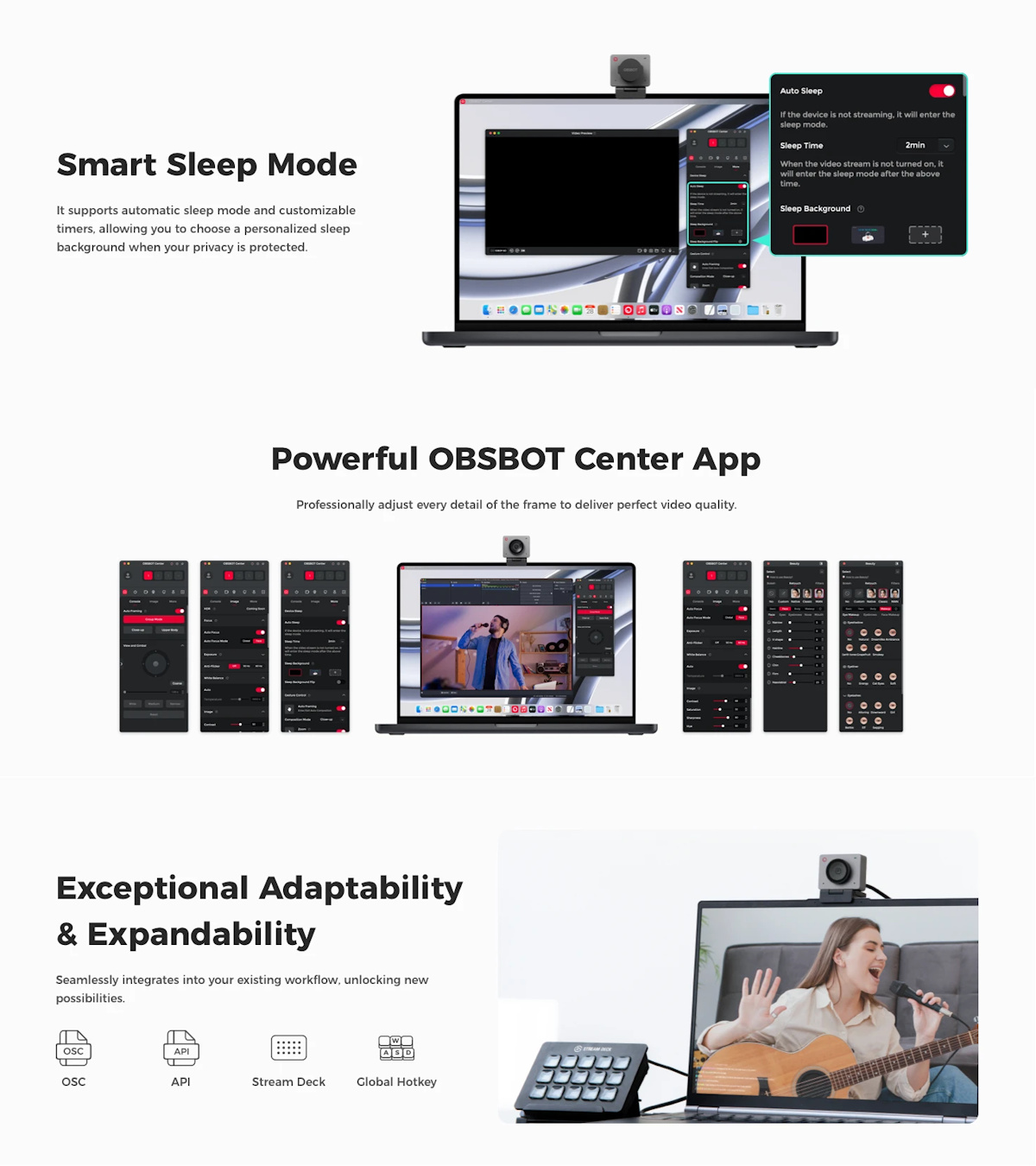 OBSBOT has designed this webcam to be completely plug and play via an included USB-C cable, and once plugged in, you're able to adjust image parameters via the OBSBOT Center application, so you can customize settings to suit the look you'd like to present in your meetings or livestreams. OBSBOT Center also enables the control of four OBSBOT devices, which allows for a multi-faceted streaming setup that can cover multiple angles. This webcam is compatible with Windows 10 or later and macOS 11 or later. Included with this webcam is a privacy cover that you place over the lens for moments that you'd like all to yourself.