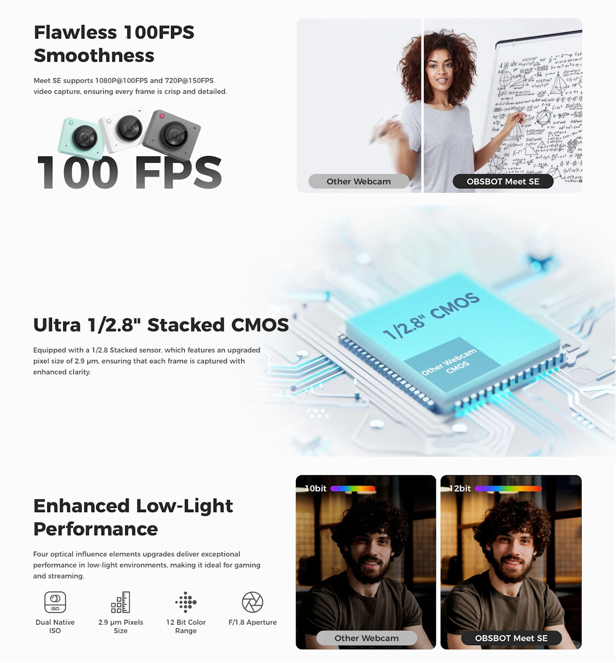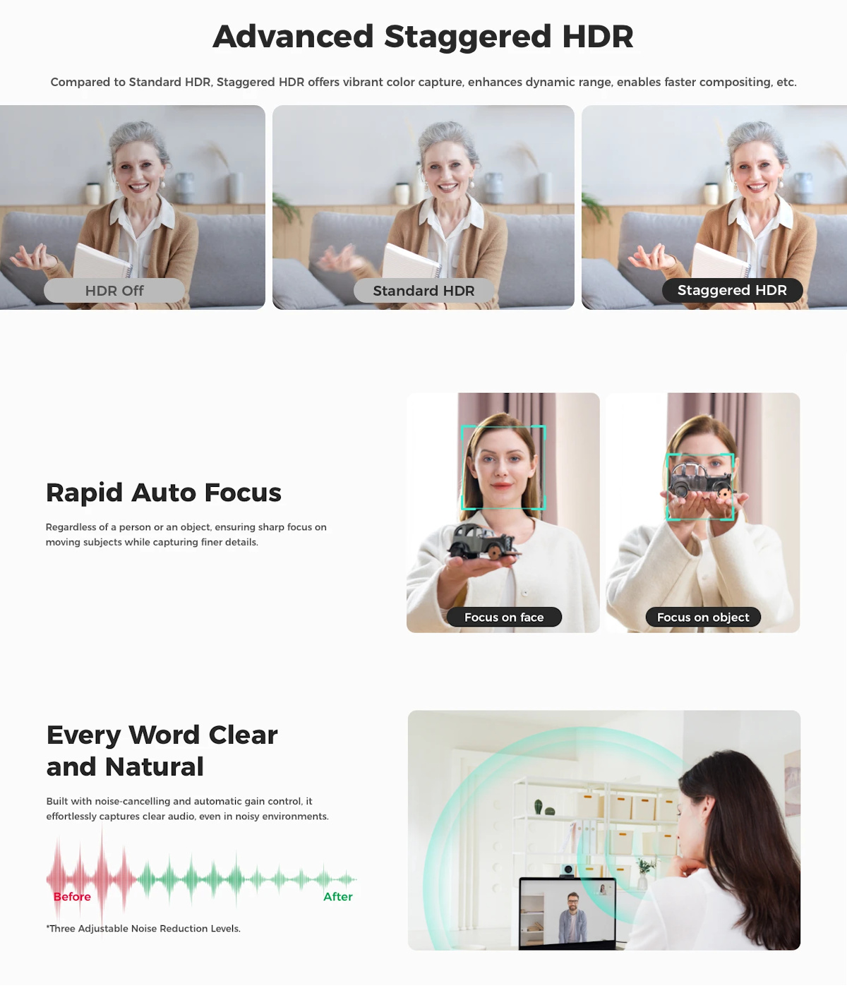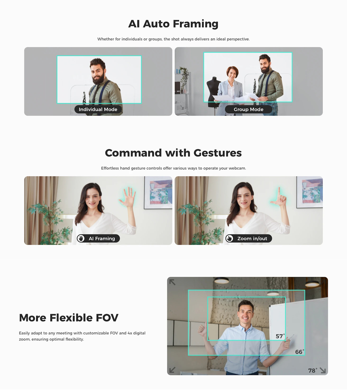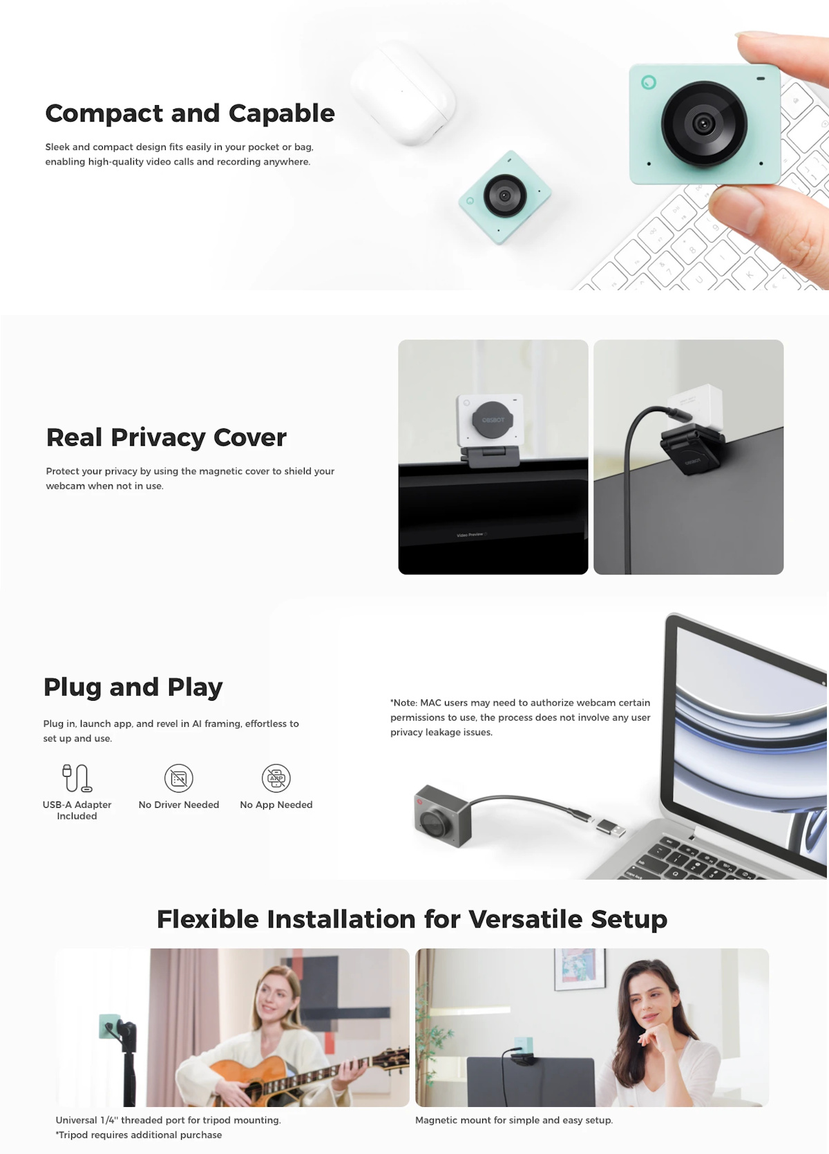 Compact and Lightweight Design 1080p at 100 fps or 720p at 150 fps Plug and Play Adjustable Settings AI Auto-Framing and Fast Auto-Focus Gesture Controls Seamless Video Orientation Switching Built-In Microphone Background Blur Windows and macOS Compatibility