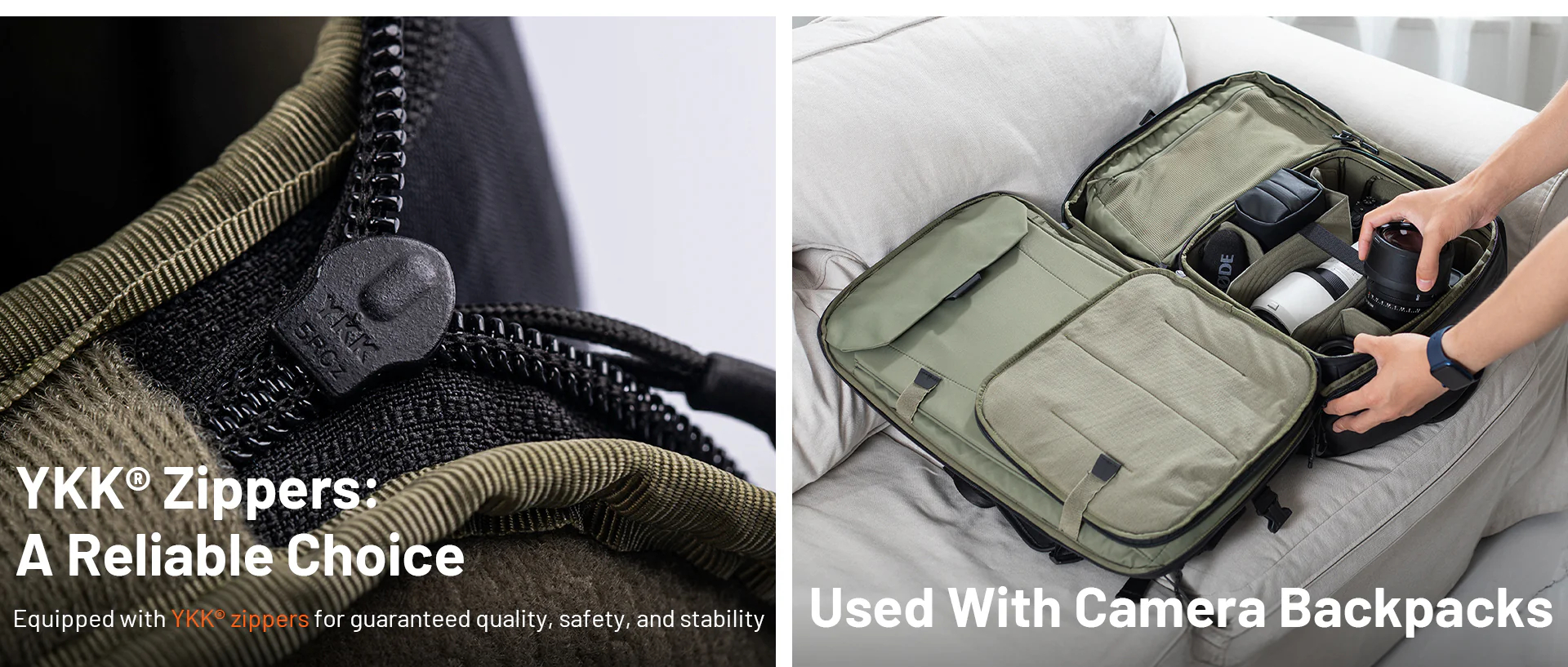 The YKK Zippers ensure security and stability with guaranteed quality. Both the fabric and zippers are treated to resist splashes. It can be used as a shoulder bag and transform to serve as a workstation (For Camera Insert XS, S and M)