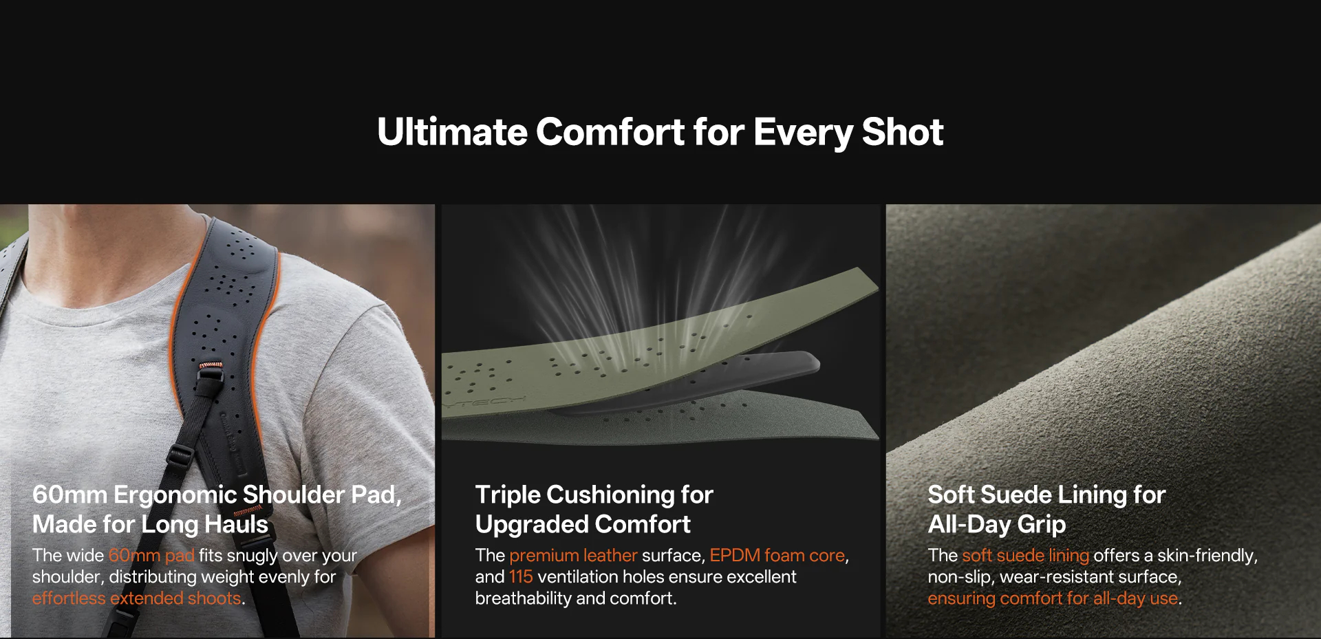 The 60mm wide shoulder pad with tapered webbing effectively distributes pressure and reduces fatigue. The microfiber outer layer, high-density foam padding, and 115 ventilation holes ensure a lightweight and breathable carrying experience.