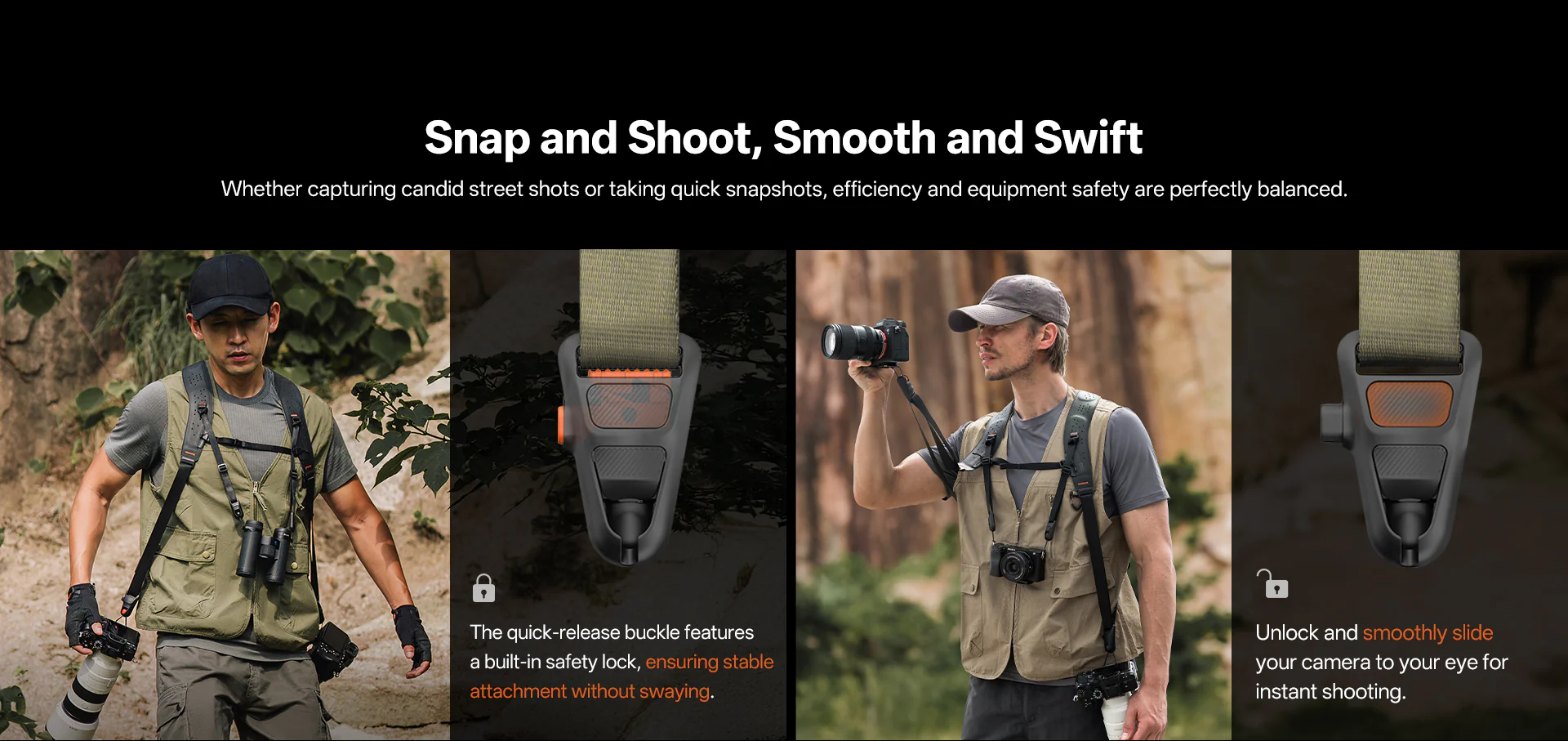 The integrated strap lock mechanism within the quick-release buckle allows easy access during shooting and automatic position locking when not in use, ensuring stable carry.