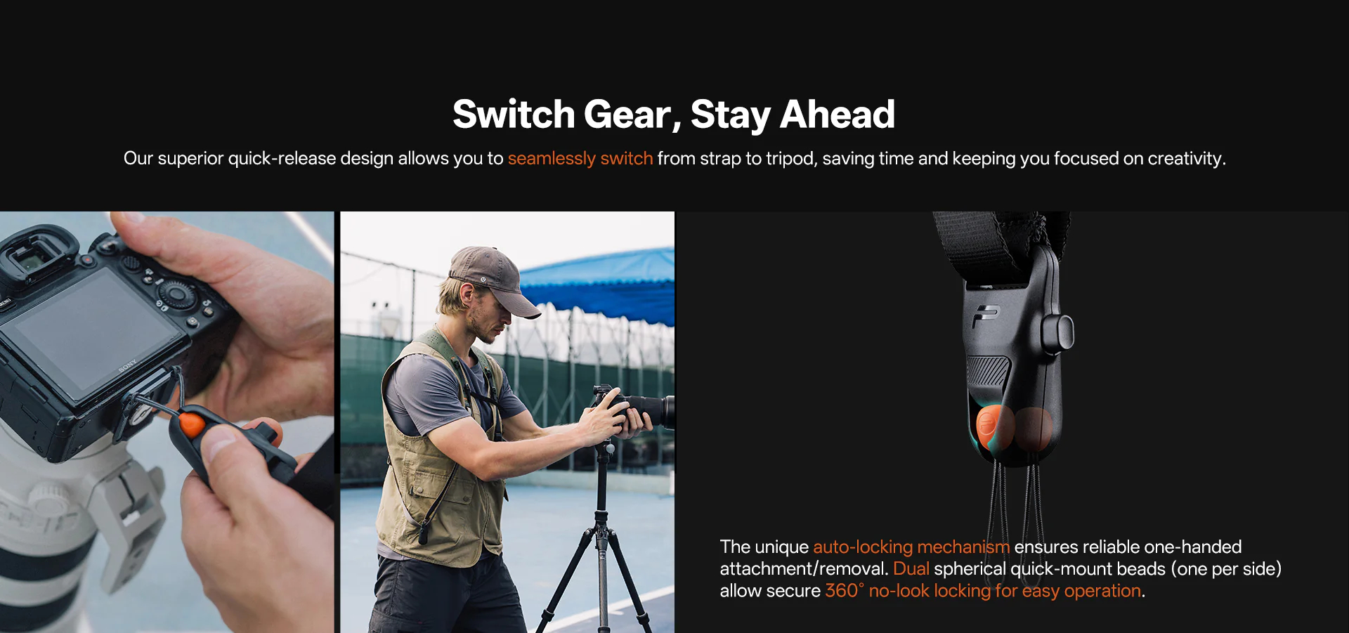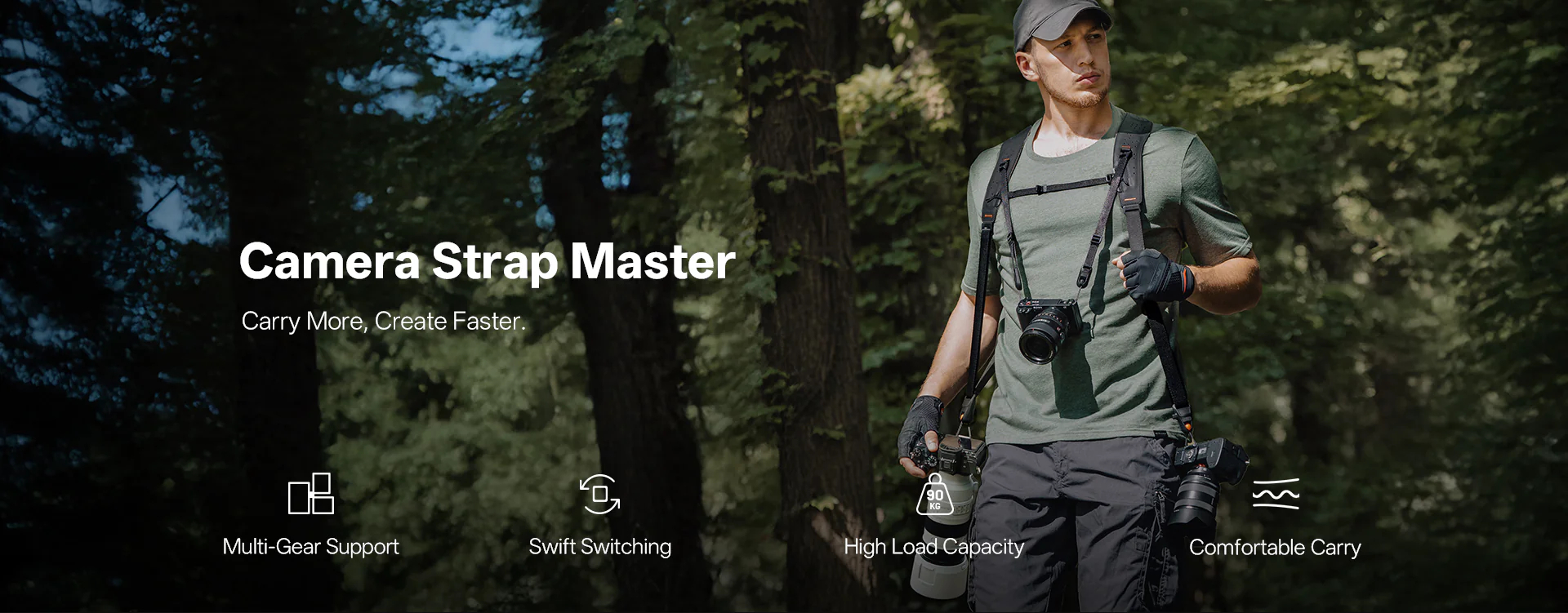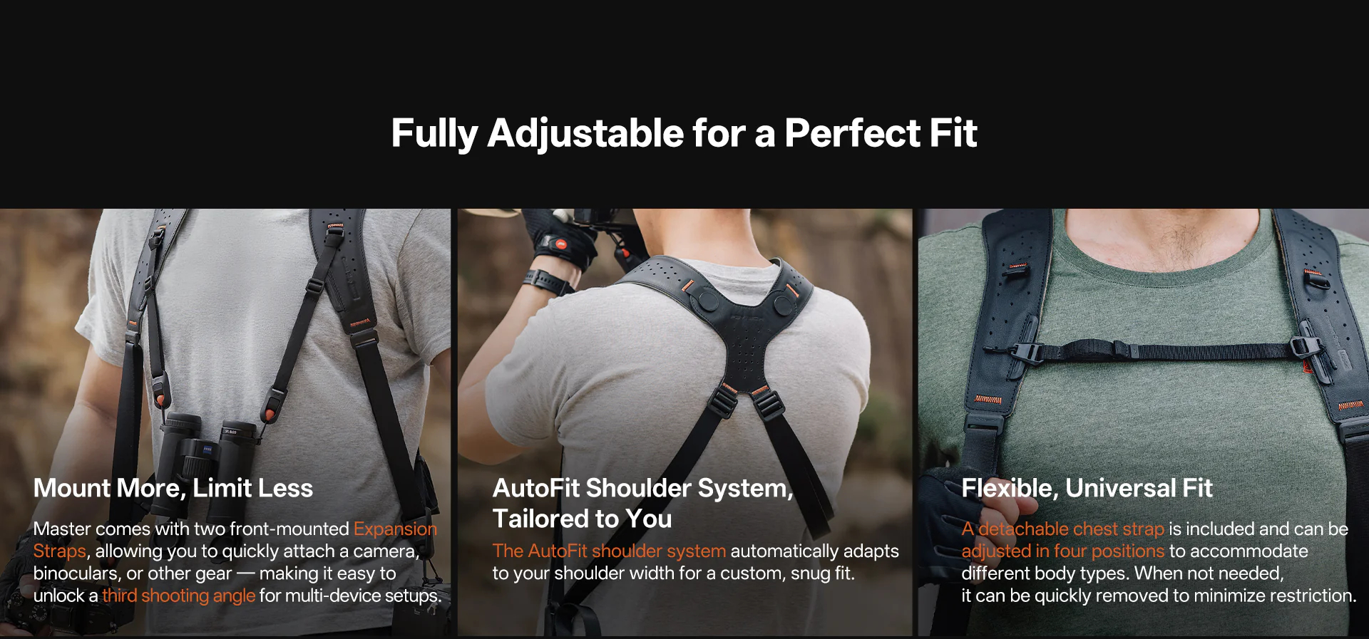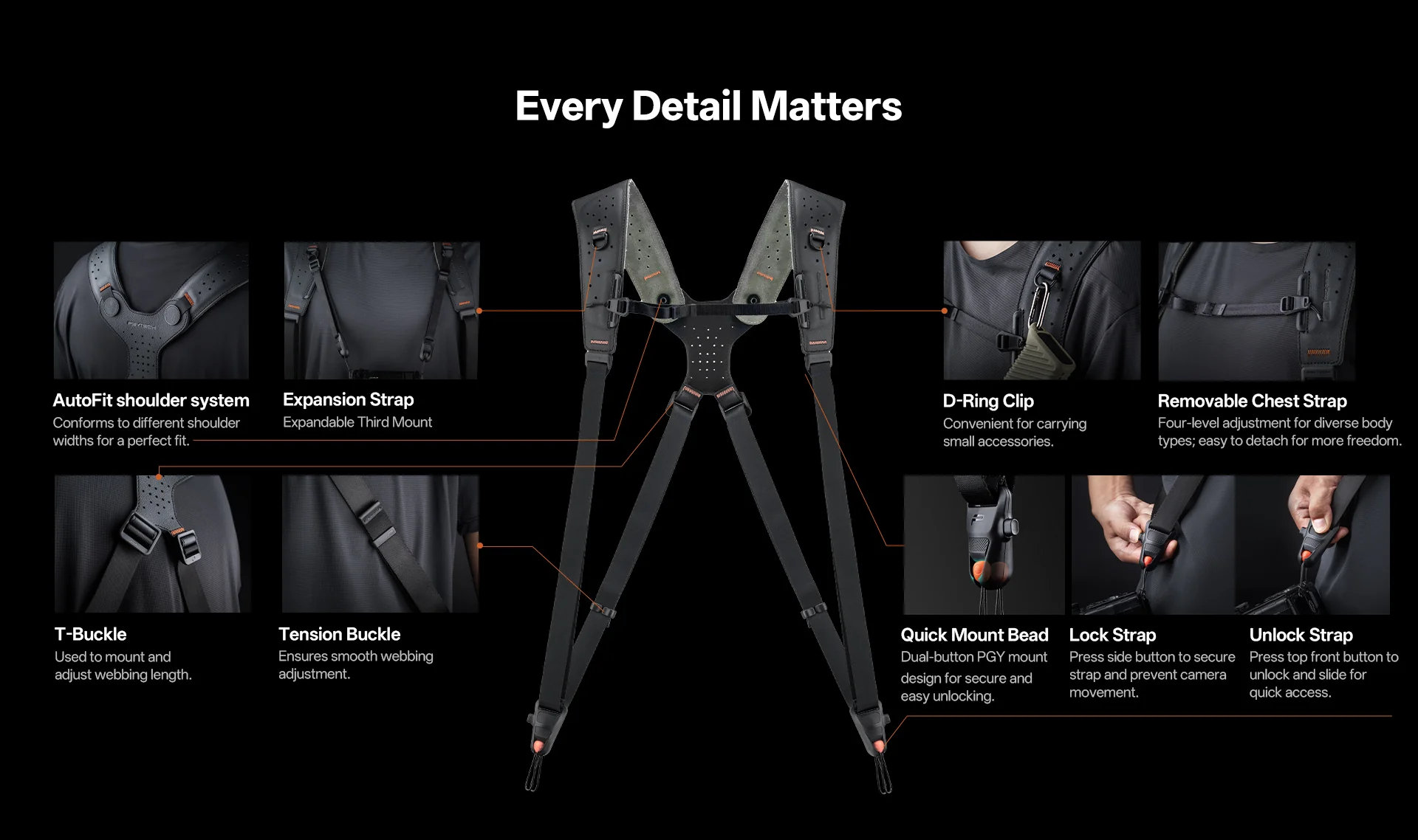 The Dual-shoulder system supports up to three camera-lens setups. Innovative quick-release buckles, paired with PGYTECH quick-release plates, enable fast strap attachment/removal and seamless camera switching between strap, tripod, and stabilizer.