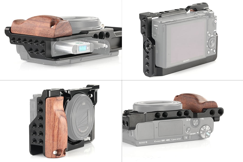 Cage for Sony RX100 M6 Seats the camera firmly with the lens ring and blocks no access to ports and buttons Removable wooden side grip for comfortable hand-held shooting Versatile interfaces (1/4’’ and nato rail) for flexible accessory attachment