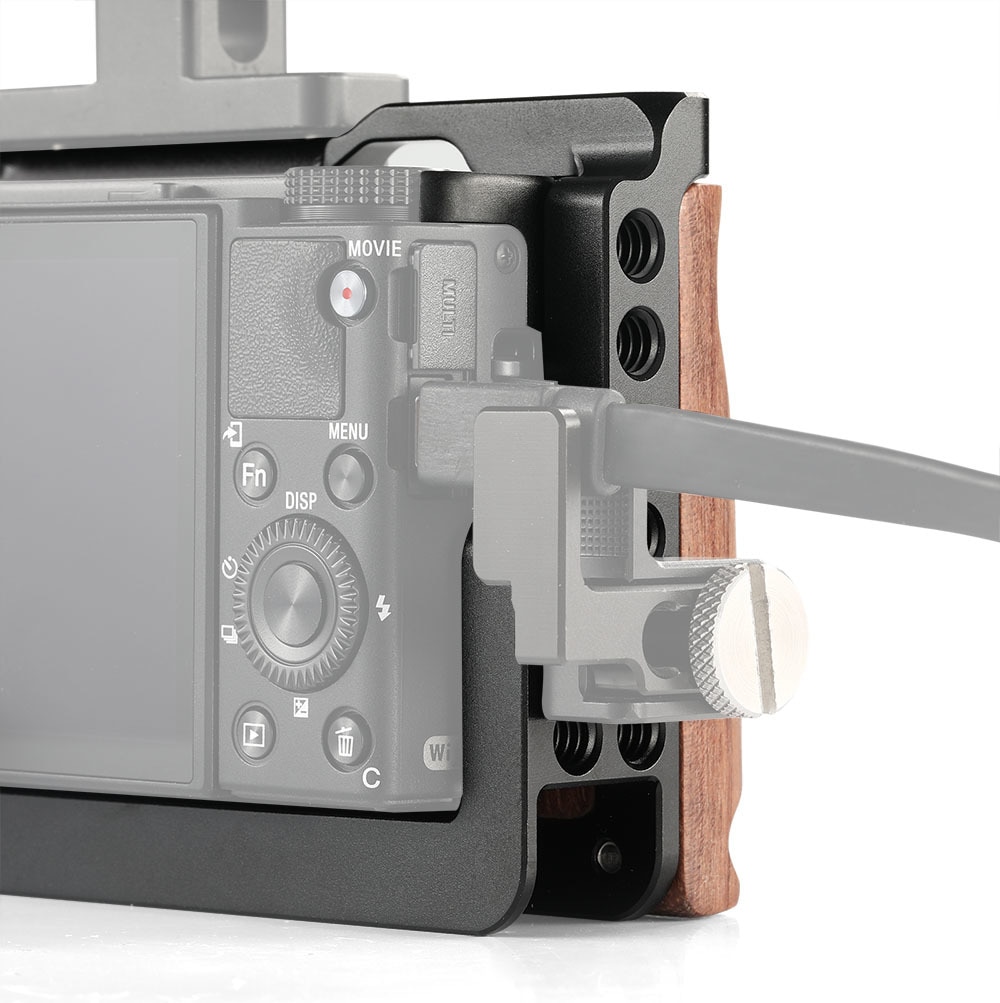 SmallRig Cage Kit 2225 is designed for Sony RX100 VI. It seats the camera firmly with the lens ring in the front of the cage. It allows the screen flipping and access to all ports and buttons on the camera. SmallRig Articulating Arm 2071 (sold separately) can be attached on the NATO rail for mounting the monitor. If you want a better protection for your HDMI cable, SmallRig HDMI cable lock 1693 (sold separately) is your best choice. Mounting threads on the bottom of the cage accept different QR plates and provided best shooting experience for vloging shooting. Wooden grip on the right side offers better hand-held shooting experience.