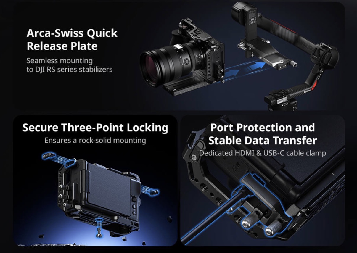 Secures the camera via one 1/4"-20 screw at the base and two M2.5 screws on the sides to prevent twisting. Bottom Arca-type plate allows for quick, direct mounting to DJI RS 2 / RSC 2 / RS 3 / RS 3 Pro / RS 4 / RS 4 Pro gimbals and tripods. Multiple 1/4"-20 holes, 3/8"-16 threads, ARRI locating holes, cold shoe mounts, and a NATO rail on the left side.