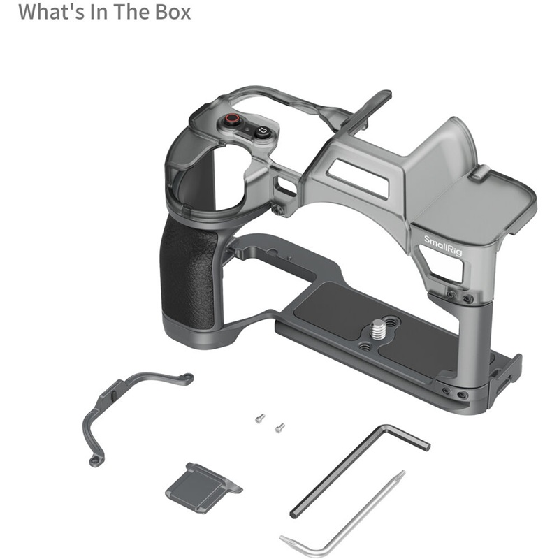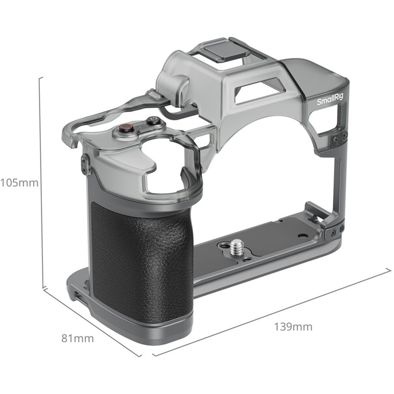 The cage features multiple parts that can be used independently, such as a hot shoe cover, baseplate, grip, and top protective cage, depending on your desired configuration. Its overall aluminum construction creates a durable and lightweight design, and soft, silicone pads on the interior protect the camera from scratches. Two strap slots are provided to add a separately available neck or hand strap.