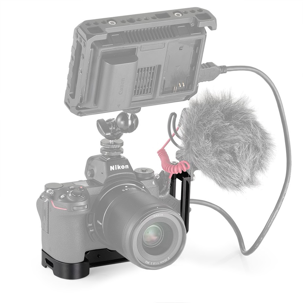 The bottom plate add 16.5mm height based on the original handgrip for pinky support. Both the base plate and side plate are Arca-type compatible dovetail plates enable the camera to mount in a vertical or horizontal position. It features a sensor centering line on each axis to align the camera on a tripod head and maintains complete access to the camera's battery and ports. The side plate can be extended to left if more room is needed for tethering or cable release. An included hex wrench on the bottom is used to tighten and adjust the L-bracket. Additionally, it is compatible with the Peak Design strap and include a hand strap loop on the right side. Furthermore, 1/4"-20 mounting holes are located on the side and bottom for accessory attachment, such as Cold Shoe Mount 1593. The front of the baseplate comes with two M4 screws for FTZ Adapter Mount 2244 to protect the lens port.